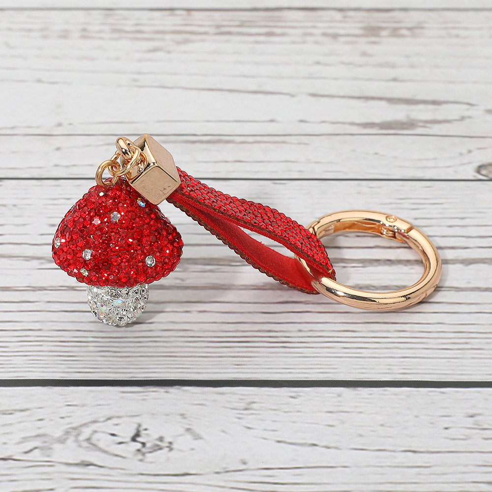 • Sparkling mushroom keychain designed with rhinestones and a handy strap. A whimsical accessory for keys, handbags, or backpacks, adding charm and playful style to everyday essentials.