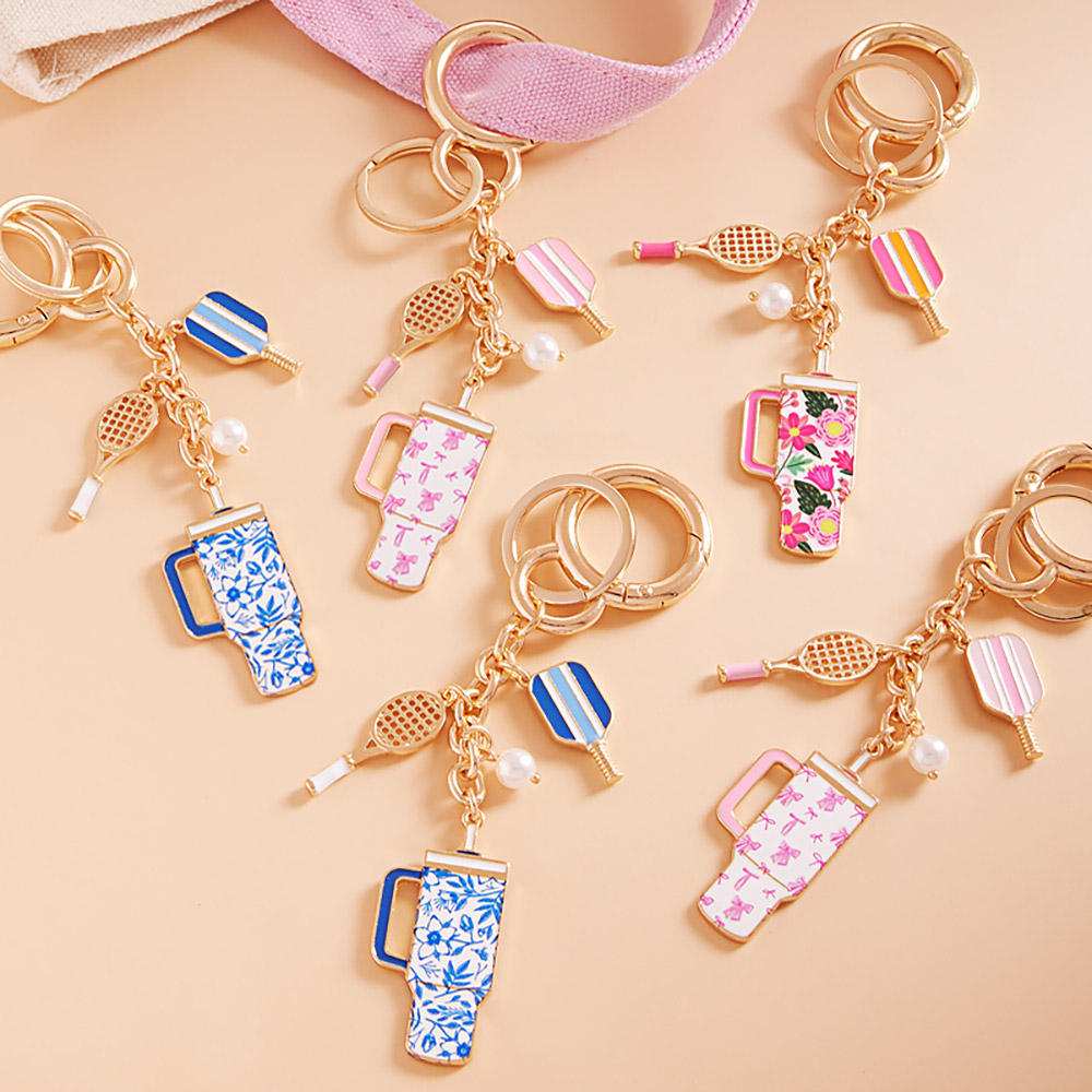 • Add playful style to your accessories with this pickleball-themed keychain featuring a paddle, tumbler, and pearl charm. A fun and functional design that makes a perfect gift for players and sports enthusiasts.