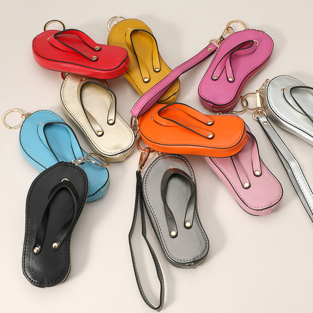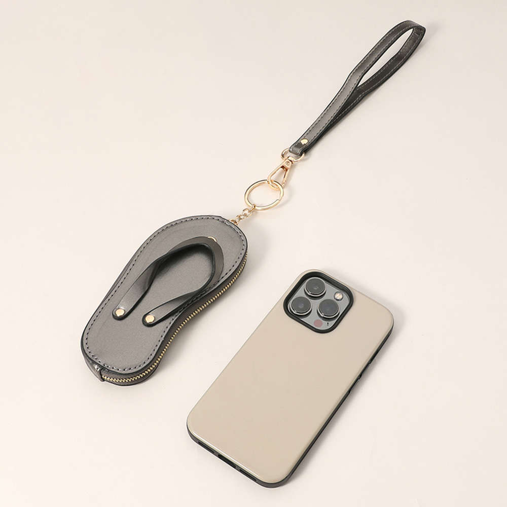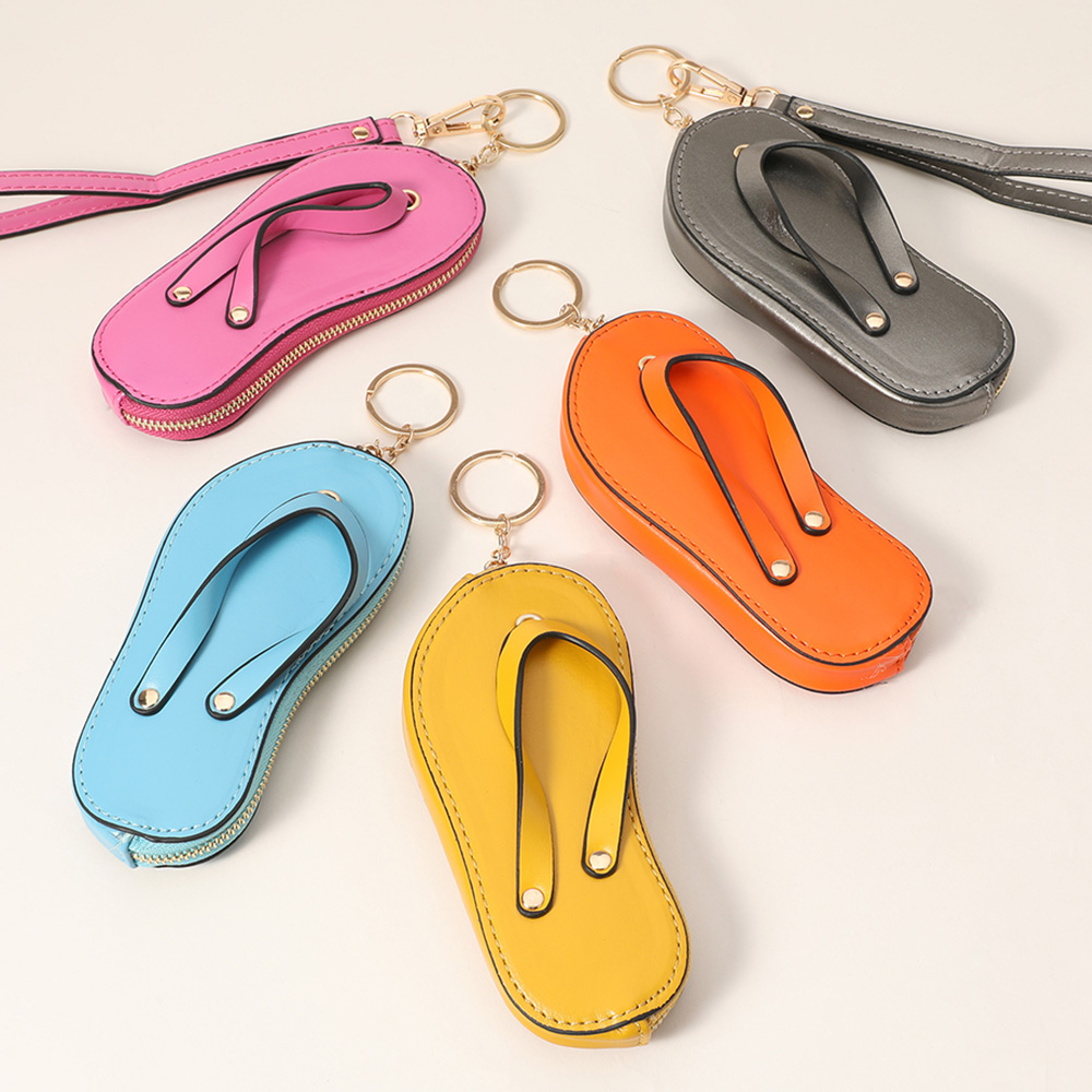 Details • Size : 8" L, 2.5" X 5.5" • Wristlet Size : 8.5" L • Zipper Closure • Fun and practical coin purse shaped like a flip-flop, featuring a secure zipper closure, detachable wrist strap, and keyring attachment. Perfect for carrying small essentials and adding charm to your keys.