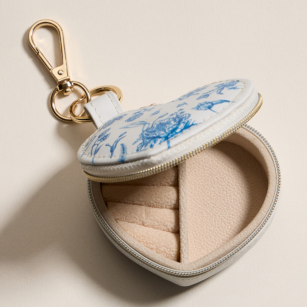 Details • Size : 3" X 2" X 1.25" • Zipper closure for secure storage • Polished gold-tone keyring with clasp hardware • Compact storage for rings, earrings & small jewelry • Ideal for travel, everyday use, or thoughtful gifts • Keep your jewelry safe and organized with this heart-shaped travel case featuring a delicate floral print. Designed with ring slots and compartments, this portable organizer includes a secure zipper closure and keychain clip, perfect for storing rings, earrings, and small accessories anywhere.