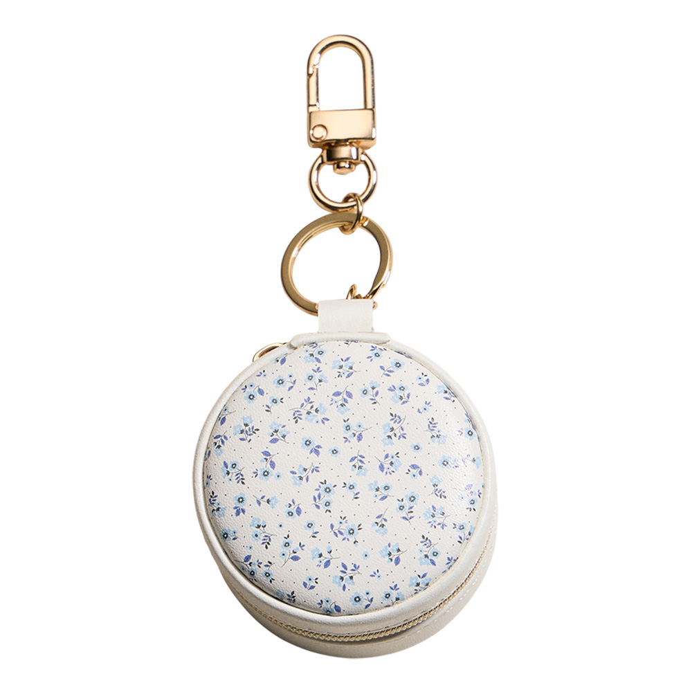 Floral Pattern Printed Round Shaped Travel Jewelry Case Keychain Bag Charm