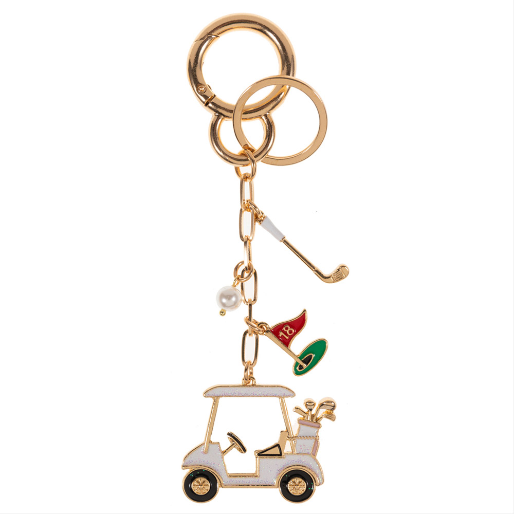 Details • Size : 4.75" L, 2" X 4" • Show off your love for the game with this golf-themed keychain featuring a glittery golf cart charm, mini club, and flag accents. Designed with chic details and a pearl touch, this accessory adds sporty elegance to your keys, bag, or tote—perfect for golf lovers and gift giving. • Lead and Nickel Compliant