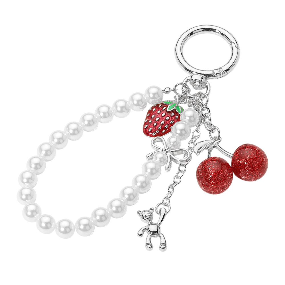 SECRET BOX_Glittered Cherry Enamel Strawberry Metal Teddy Bear Pearl Beaded Charm Keychain / Bag Charm