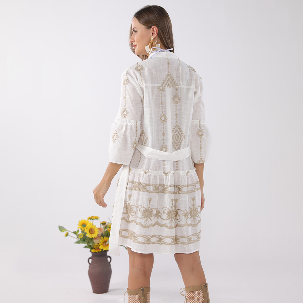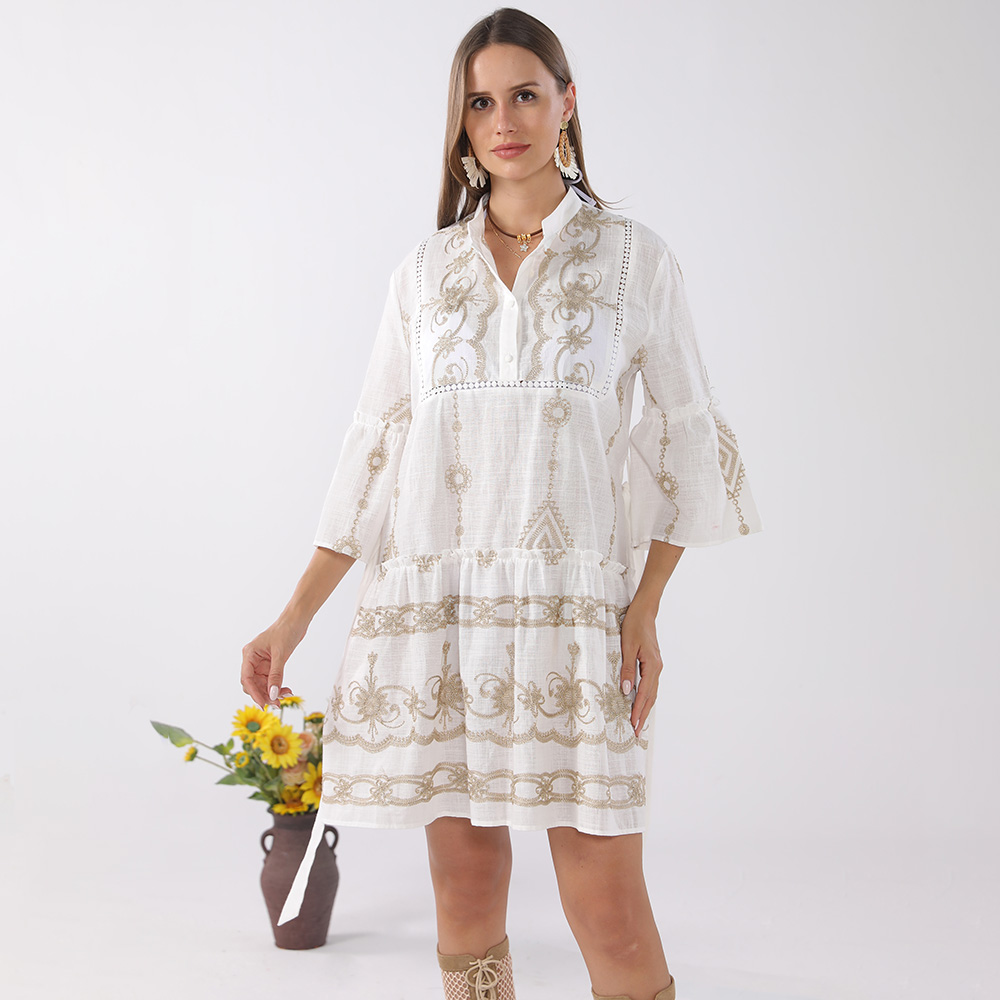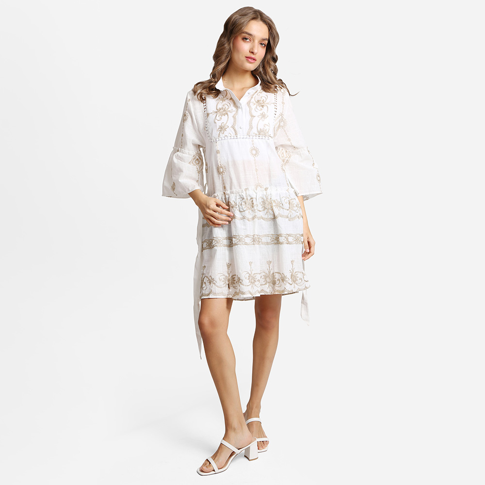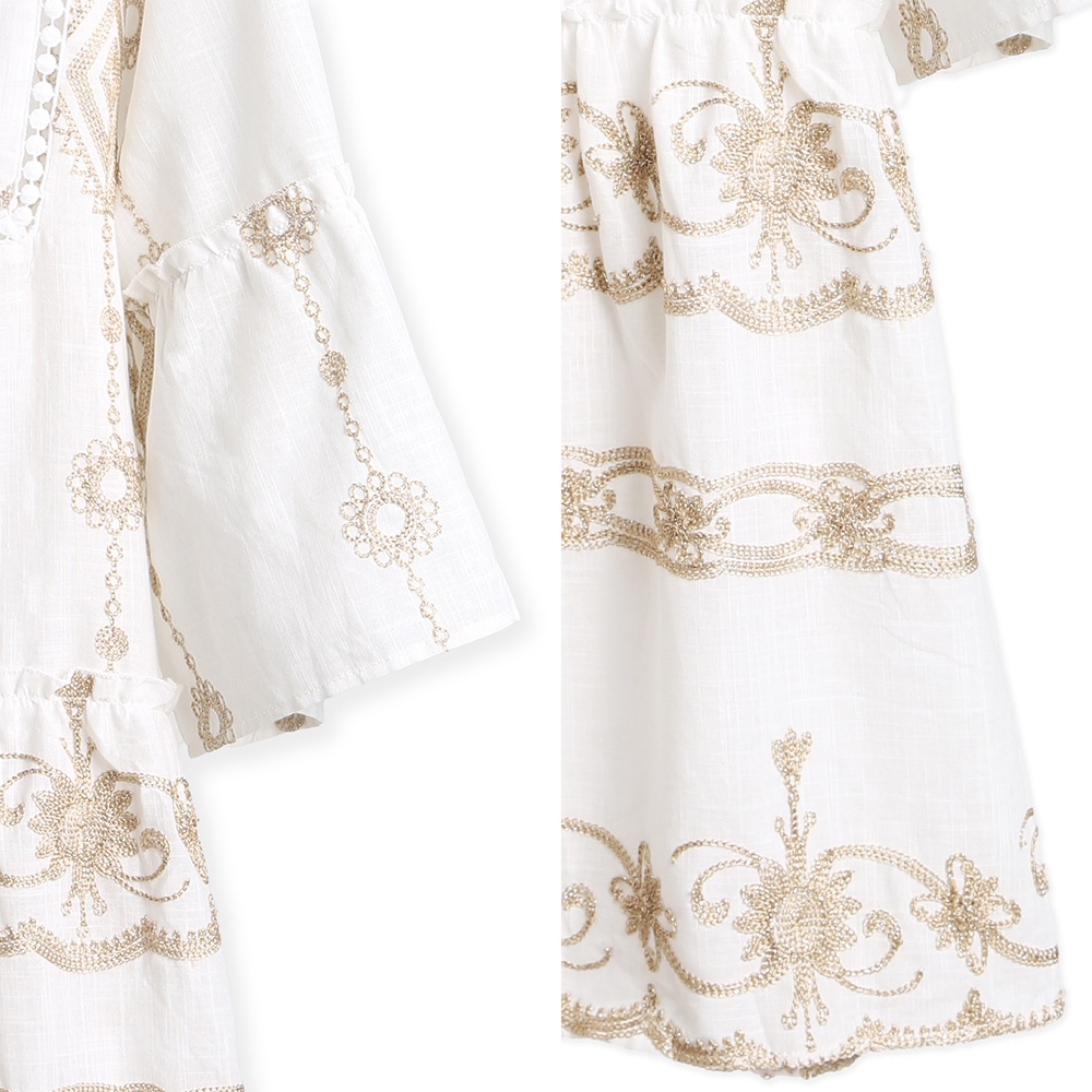 Details • Size : One Size • Material : 50% Cotton, 50% Viscose • Exquisite embroidery details add charm and elegance • Flowy silhouette for all-day wear • Flattering bell sleeves add feminine touch with a trendy boho vibe • Wear it as a dress, tunic, or chic vacation cover-up • Breathable and lightweight fabric : Ideal for summer, travel, or layering