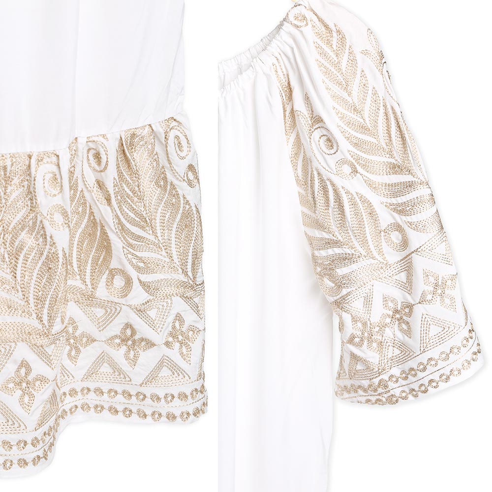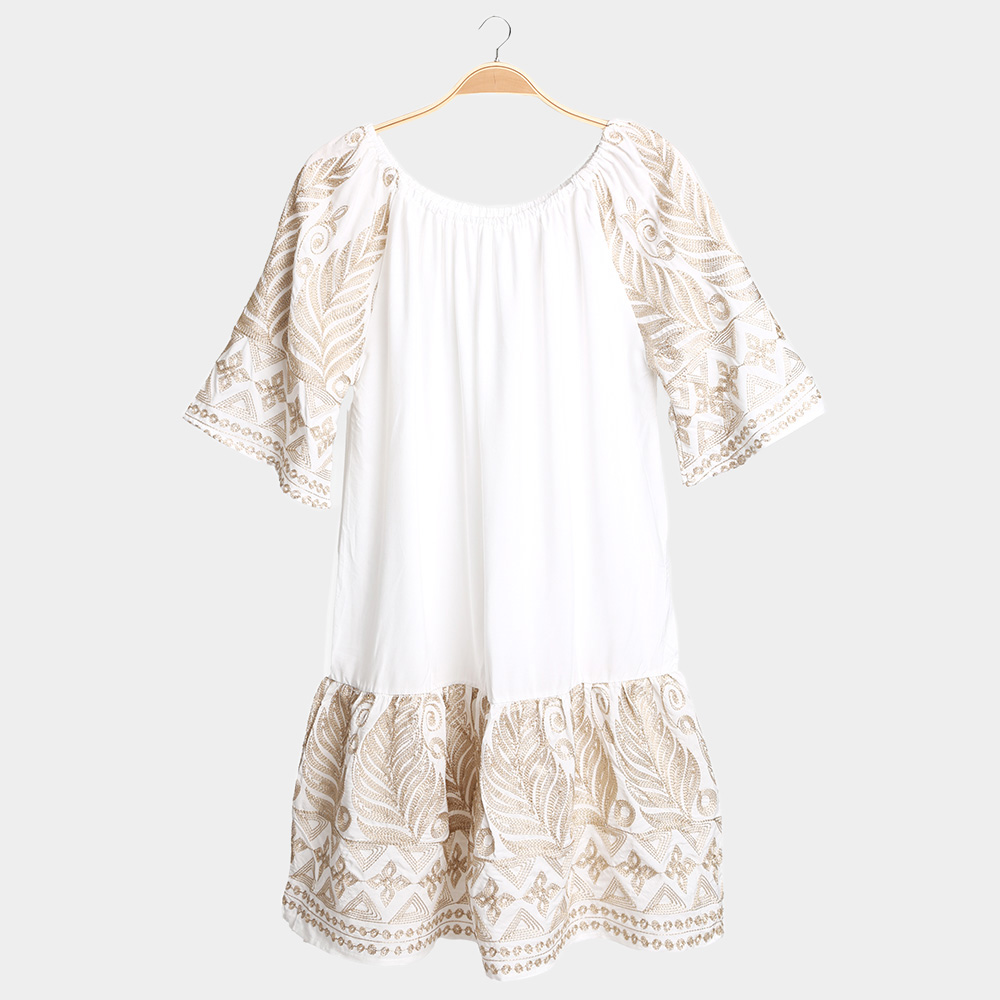 Details • Size : One Size • Material : Viscose • Boho-style beige dress with bold embroidered leaf and geometric patterns on sleeves and hem. Features a flowy silhouette, wide neckline, and soft viscose fabric—ideal for warm weather and laid-back chic.