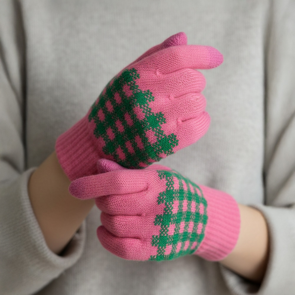Details • Size : One Size • Material : 70% Polyester, 30% Wool • Smart Touch • Stay warm and connected with these knit touchscreen gloves featuring a festive plaid pattern. Designed for comfort and functionality, they allow you to use your devices without removing your gloves during chilly days.
