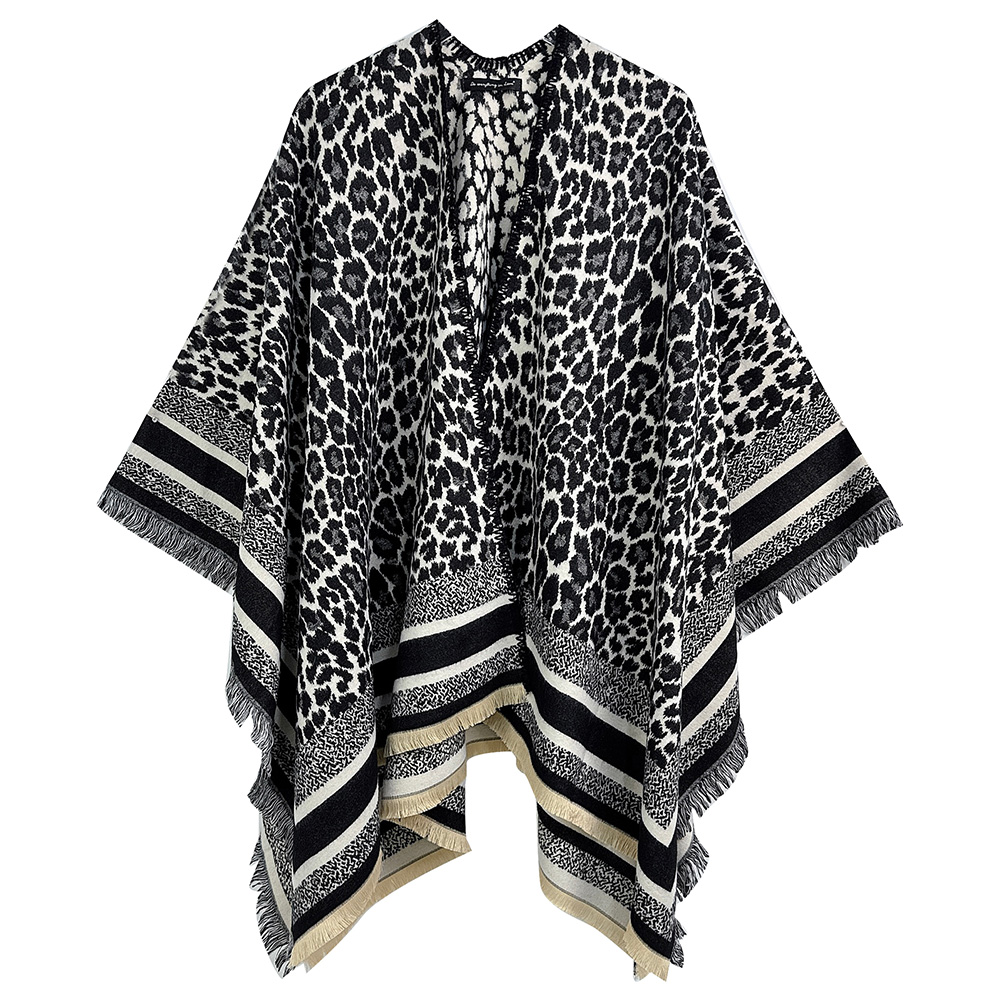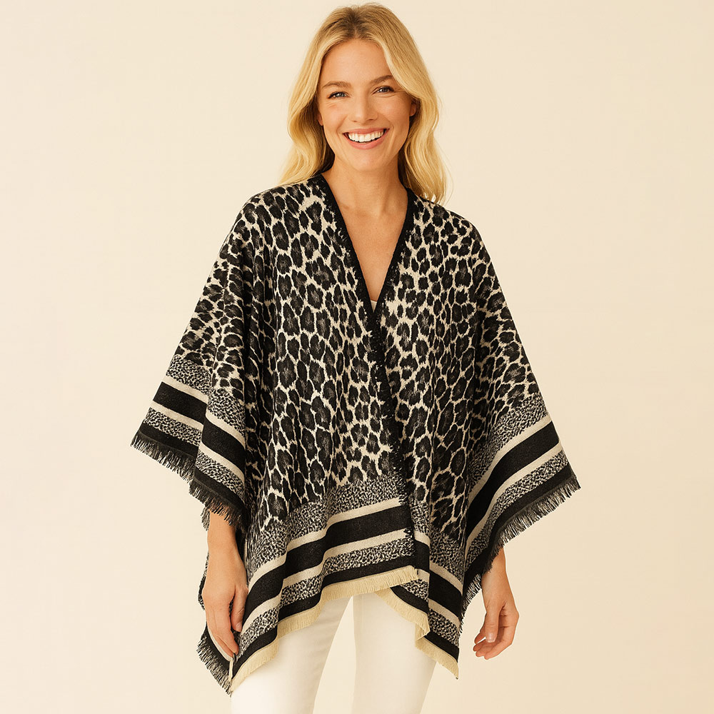• Stay warm and stylish with this poncho featuring a soft leopard-inspired pattern and elegant fringed edges. Perfect for layering over any outfit, it offers a blend of comfort, versatility, and sophistication for both casual days and chic evenings.
