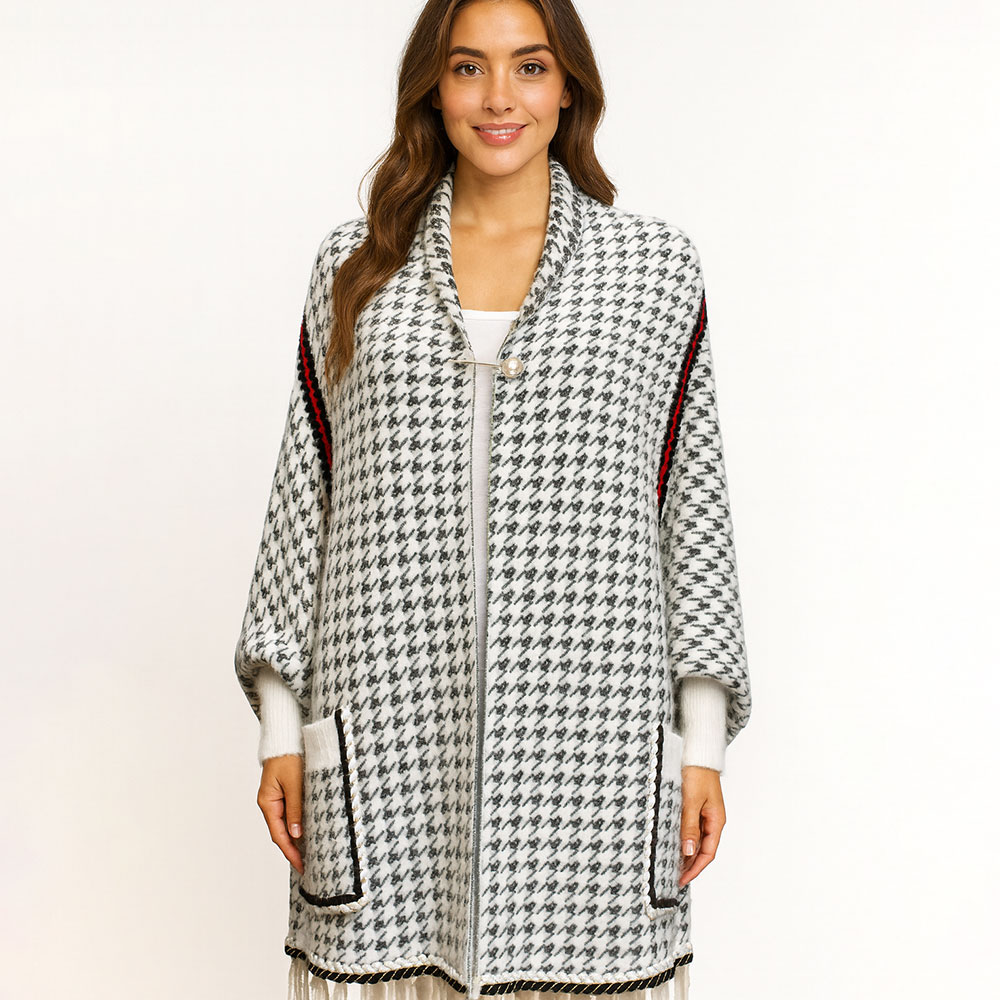 Details • Size : 44" X 54" • A chic open-front cardigan wrap featuring an oversized houndstooth pattern, contrast trim, roomy sleeves, and fringe hem. Designed for comfort and style, it layers effortlessly over casual or dressy outfits, making it perfect for everyday wear, travel, or gifting.