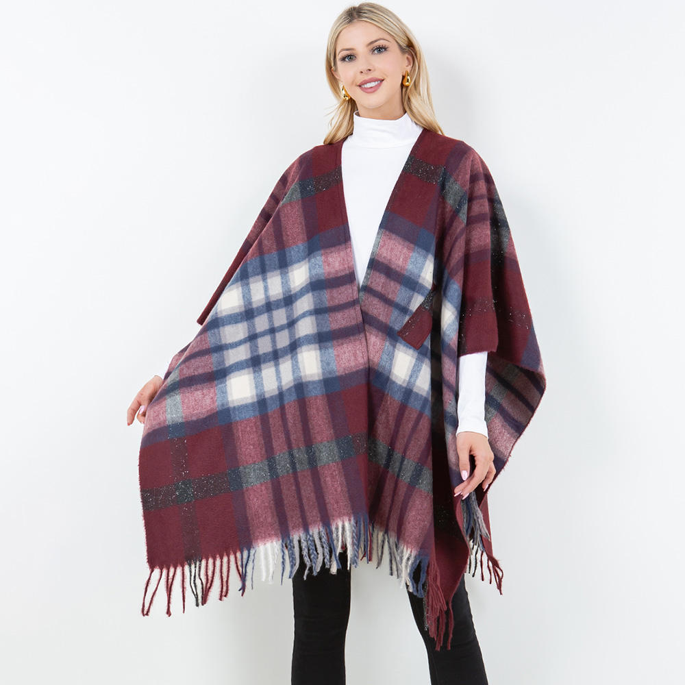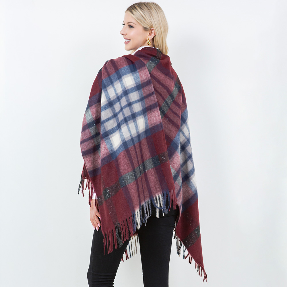 Details • Size : One Size • Material : 100% Acrylic • Wrap yourself in comfort and timeless style with this plaid oversized shawl. Designed with soft fringe detailing, it can be worn as a wrap, poncho, or scarf. Perfect for layering over casual or dressy outfits, it adds warmth and chic flair to any ensemble.