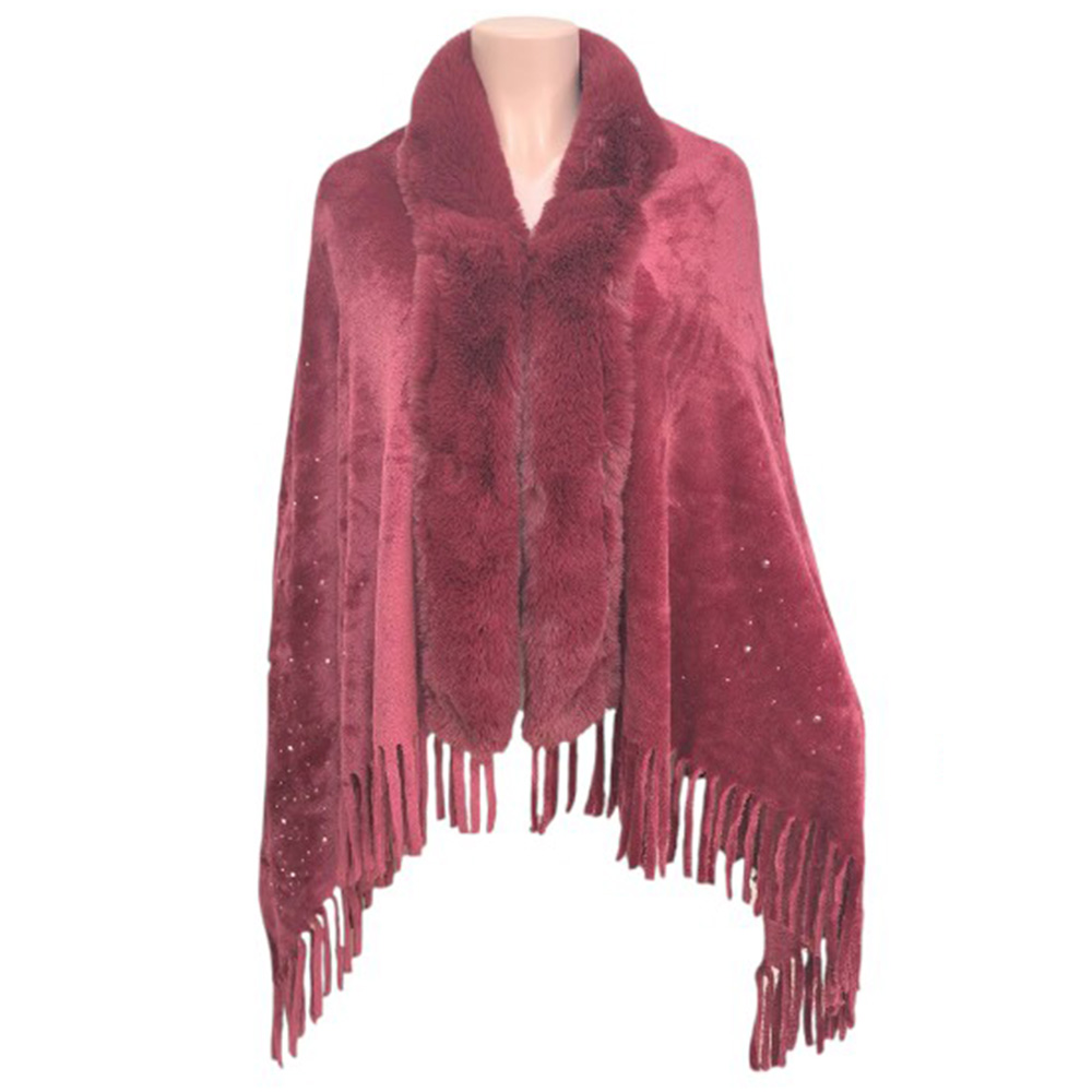 Details • Size : One Size • Material : 100% Polyester • Elegant faux fur shawl wrap featuring soft texture, fringe trim, and subtle rhinestone accents for added sparkle. Perfect for evening events, parties, or cold-weather outings, this luxurious wrap adds warmth and sophistication to any outfit with timeless charm.