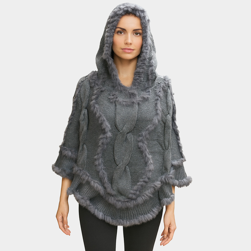 • Cozy knitted poncho with soft rabbit fur trim and a stylish hood. Perfect for layering, adding warmth and elegance to your autumn and winter outfits.