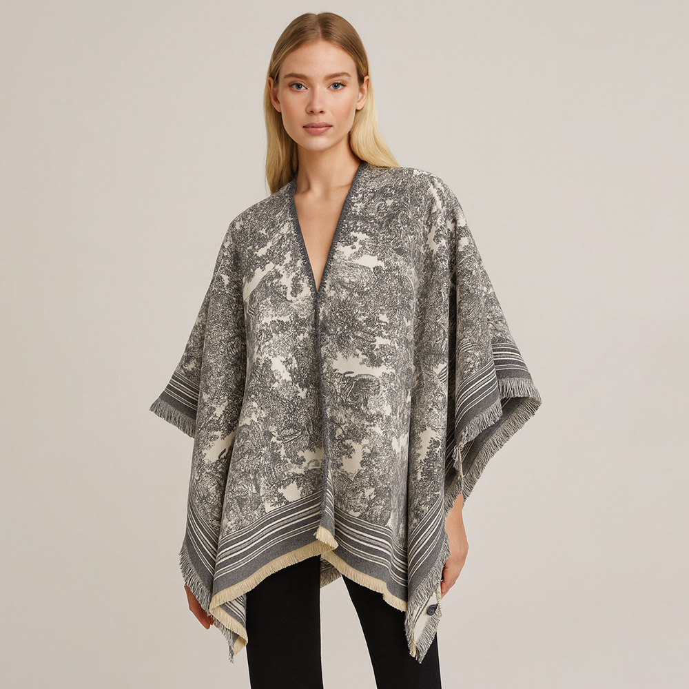 • Add a touch of sophistication to your look with this textured jacquard poncho featuring subtle patterns and delicate fringe detailing. Its soft drape and open-front design make it a versatile layering essential for effortlessly refined everyday style.