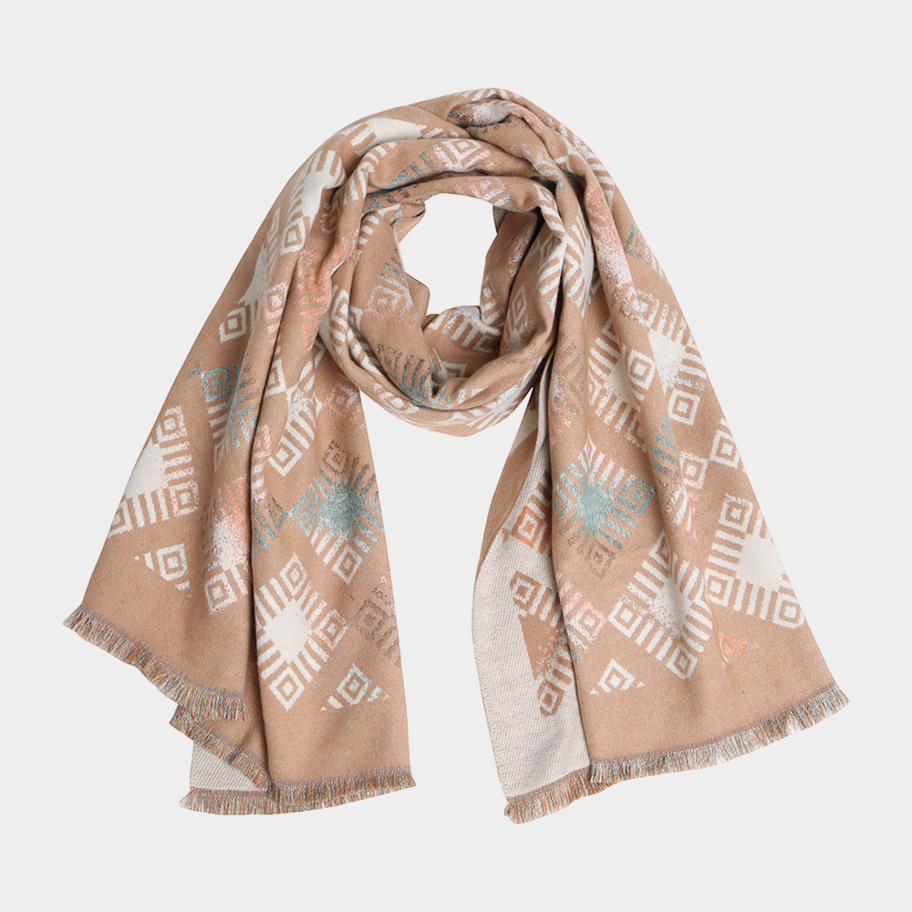 • A soft scarf featuring a bold geometric pattern with fringe edges. Lightweight and cozy, this versatile accessory adds warmth and a modern statement touch to everyday and seasonal looks.