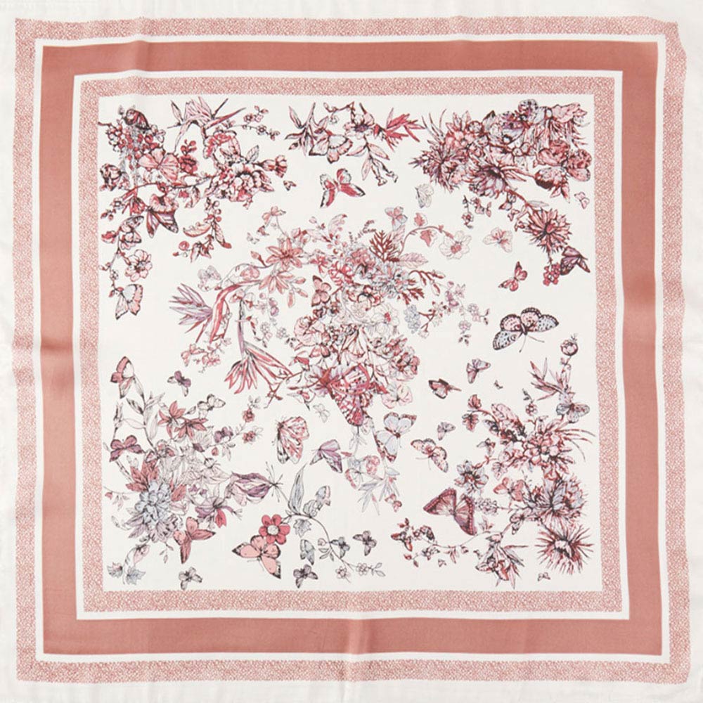 • Float into style with this exquisite square scarf, featuring a dense, beautiful print reminiscent of Chinoiserie or toile designs. The pattern is filled with delicate butterflies and lush, detailed floral bouquets primarily in beautiful shades of blue and white, framed by a striped border. Made from a smooth, satin-feel fabric, this elegant accessory adds a layer of intricate beauty and sophistication to any look.