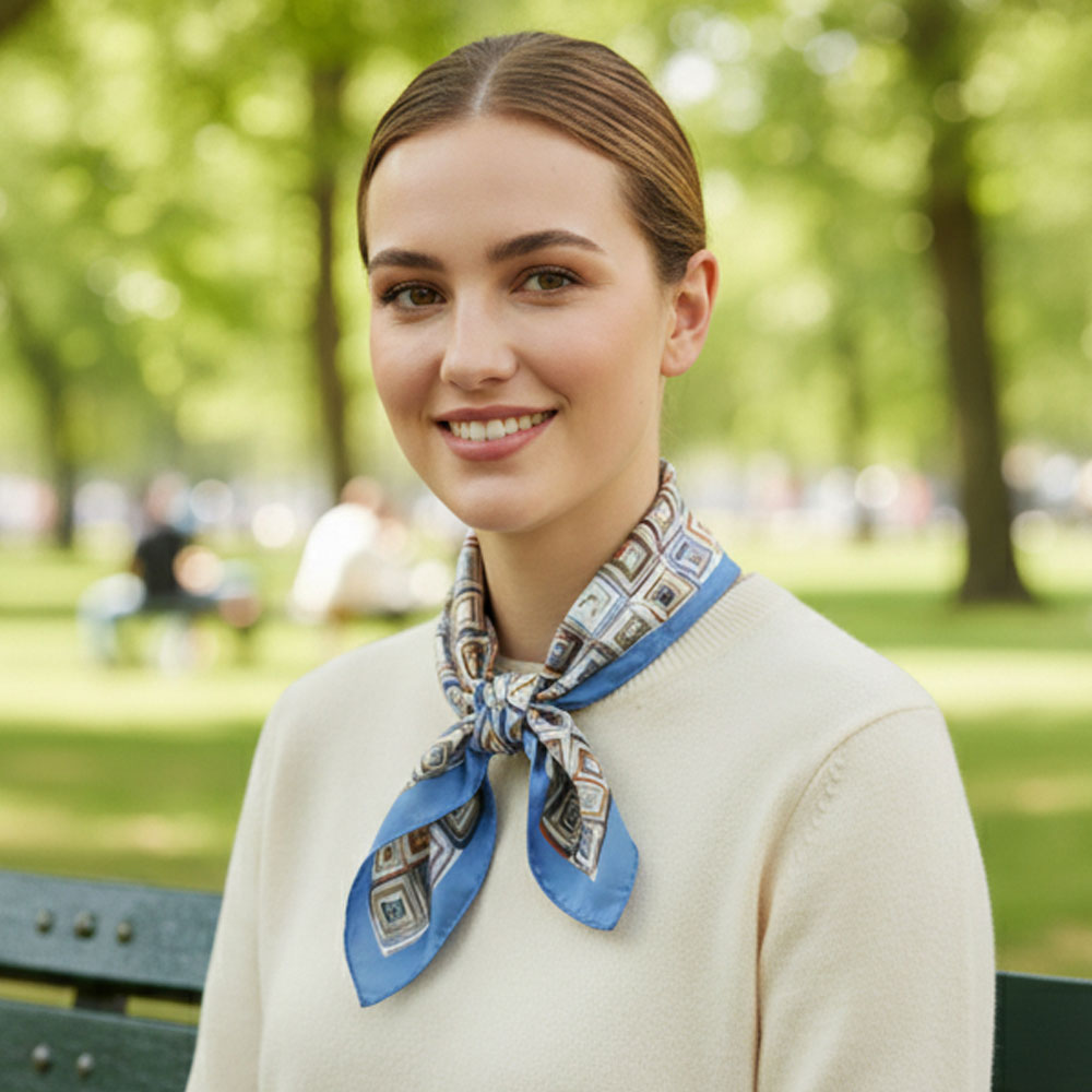 • Modern geometric print scarf featuring layered square motifs with an artistic abstract style. This versatile accessory can be worn as a neck scarf, head scarf, hair tie, or wrapped on a handbag for a chic finishing touch. Lightweight and easy to style for travel, work, weekends, and gifting. A stylish way to elevate everyday outfits with a unique patterned design.