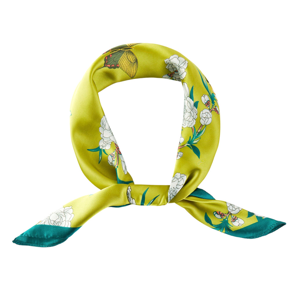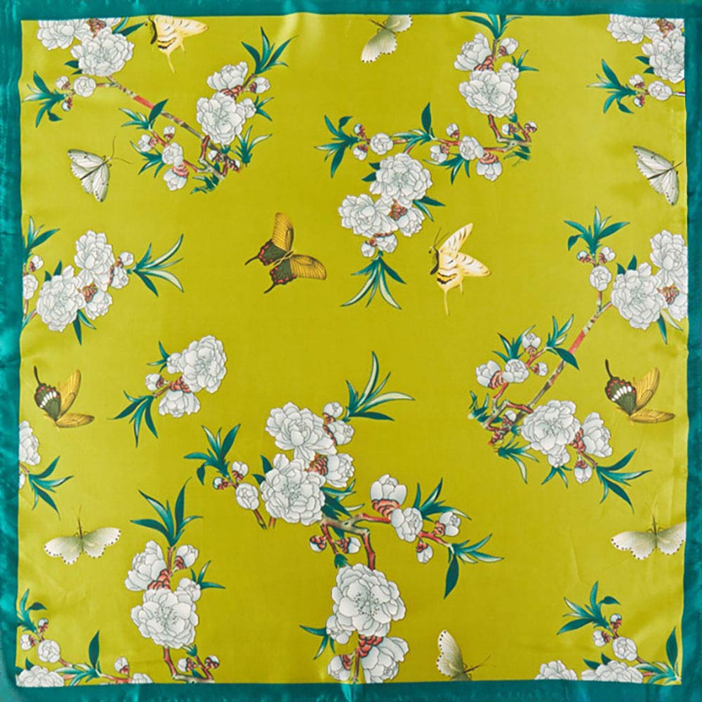 Details • Size : 27.5" X 27.5" • Material : 100% Polyester • Make a bold statement with this eye-catching square scarf. It features a dynamic print of blooming white flowers and flourishing branches accented by various butterflies, all framed by a contrasting border. The luxurious, satin-feel fabric brings the intricate, Chinoiserie-inspired design to life. This statement piece is perfect for adding a pop of pattern and texture to your outfit, whether worn as a neckerchief, head wrap, or tied to your favorite bag.