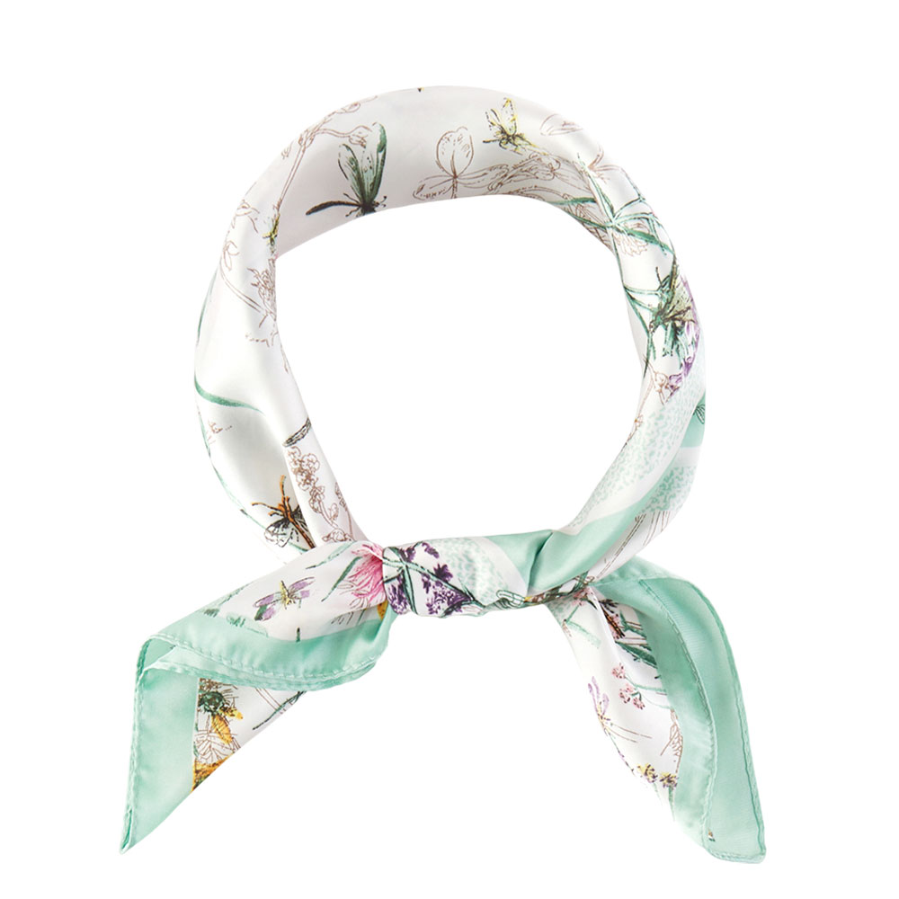 Details • Size : 27.5" X 27.5" • Material : 100% Polyester • This square scarf showcases a delicate botanical pattern that adds an elegant, nature-inspired touch to any outfit. Its lightweight design makes it perfect for styling as a neck wrap, hair accessory, or bag accent, bringing subtle charm and versatility to everyday looks.