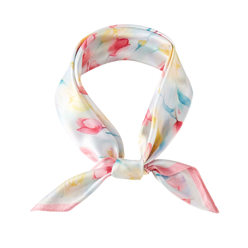 • This square scarf features a soft watercolor tulip design that adds a fresh, romantic touch to any look. Its lightweight feel and versatile styling options make it ideal as a neck scarf, hair accessory, or bag accent, bringing graceful charm to everyday outfits.