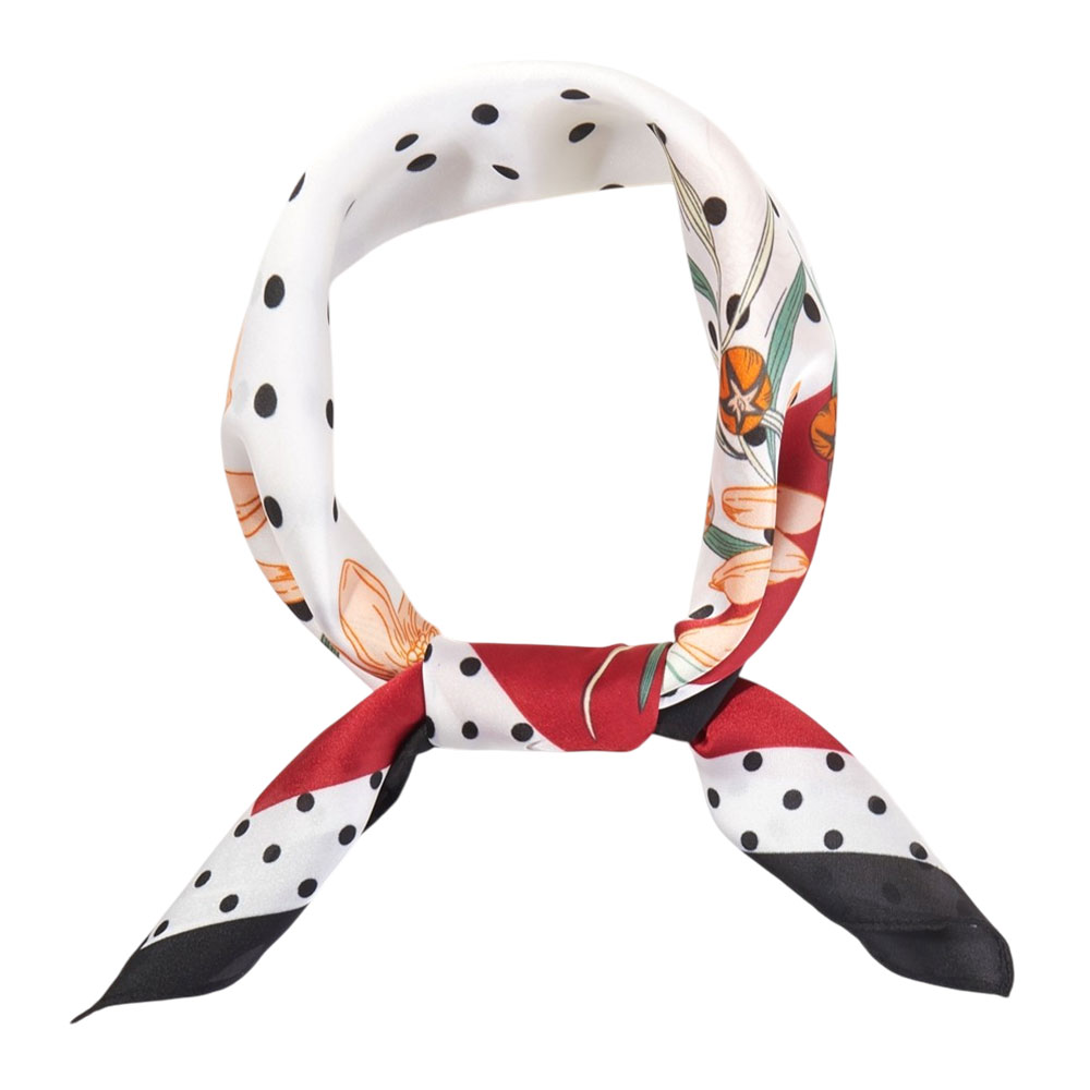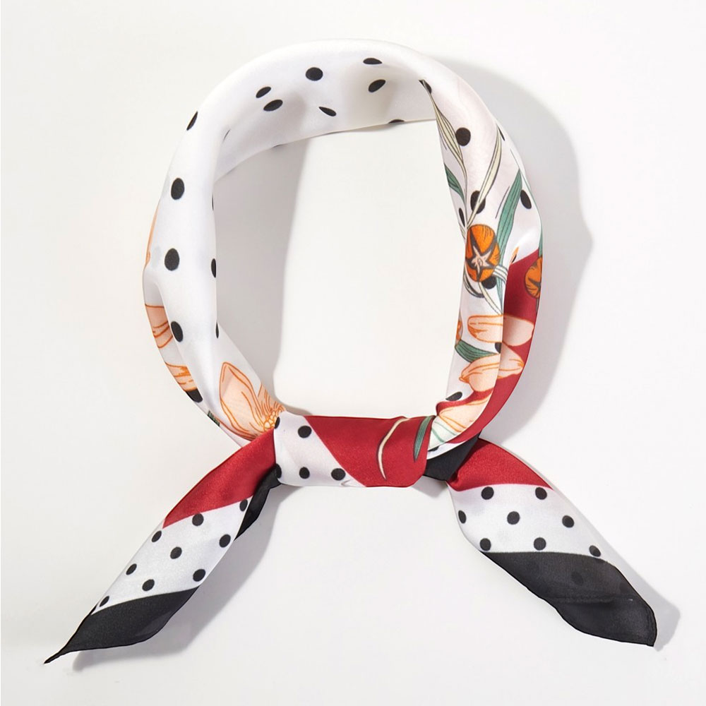 • Elegant square fashion scarf featuring a floral border with classic polka dot detailing. Designed for versatile styling around the neck, hair, handbag, or wrist, this timeless accessory adds a refined, feminine accent to everyday looks, seasonal outfits, and curated boutique collections.