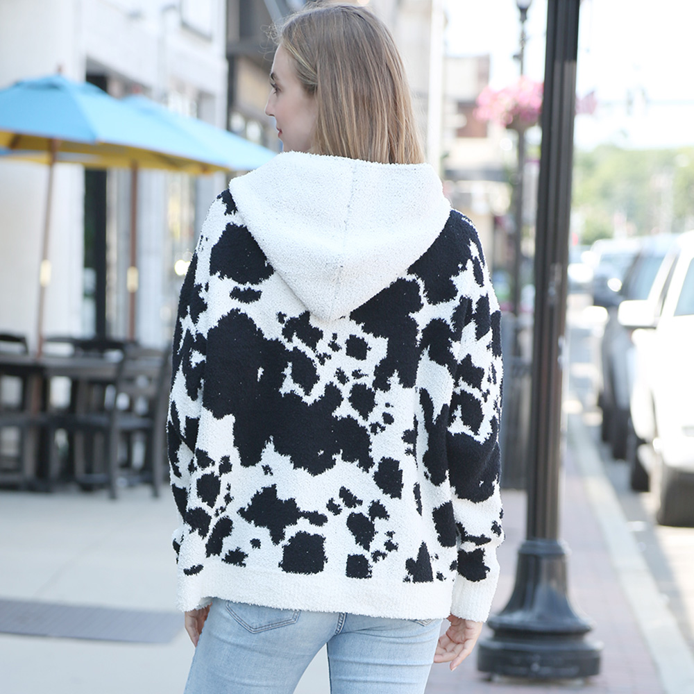 Cozy Cow Pattern Hooded Sweater with Pocket