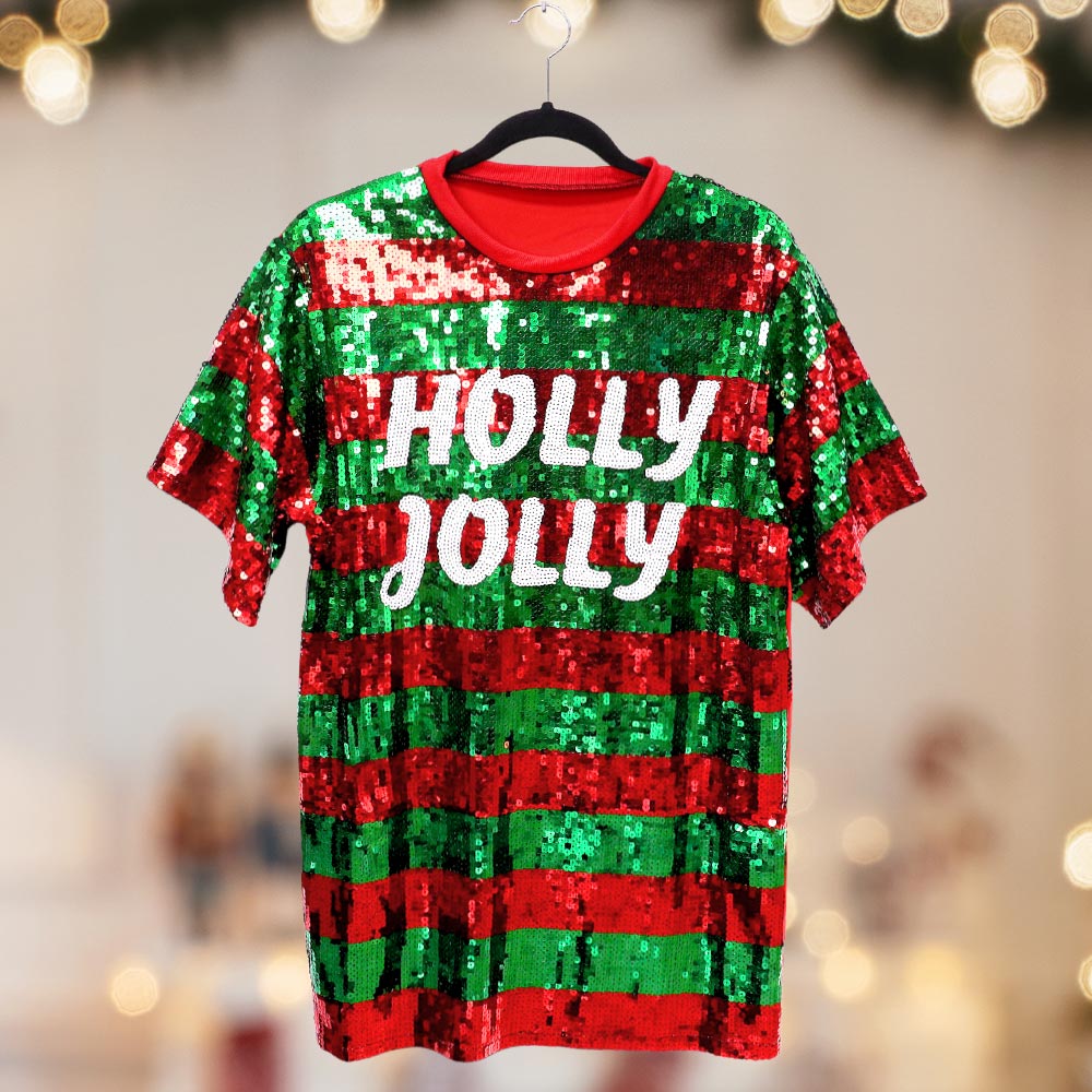 Details • Size : One Size • Bust Size : 42" - 45" L, Length : 30" L • Material : 100% Polyester • Celebrate the season in style with this plus size “Holly Jolly” sequin dress, designed for comfort and sparkle. Featuring a festive striped pattern and playful holiday lettering, it’s the perfect choice for Christmas parties, gatherings, and joyful holiday photo moments.