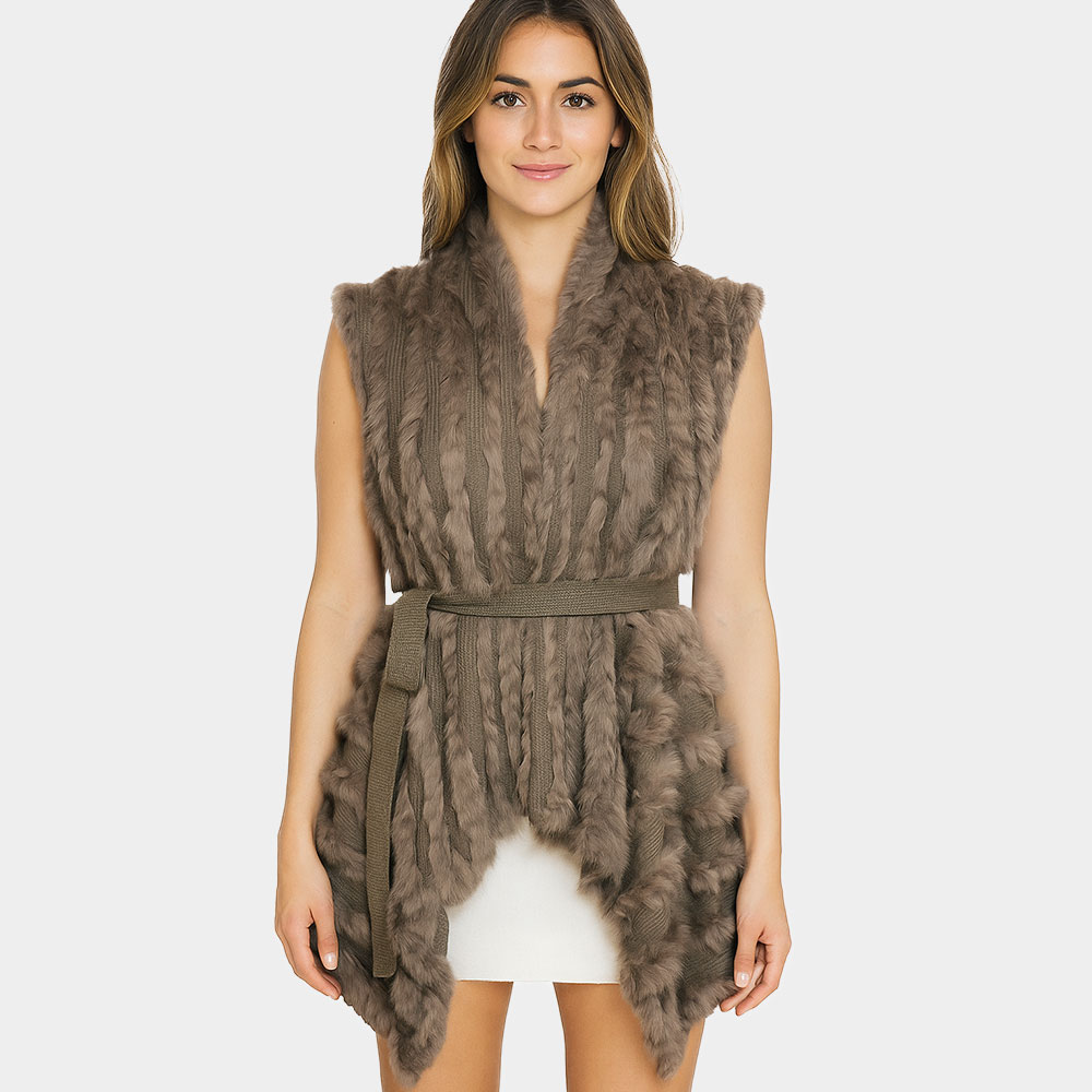 Details • Size : One Size • Material : 100% Faux Fur • This elegant belted sleeveless vest adds sophistication to any look with its plush texture and modern silhouette. Designed with an adjustable waist tie and cascading hem, it flatters every figure while providing cozy comfort—perfect for layering over chic or casual outfits.