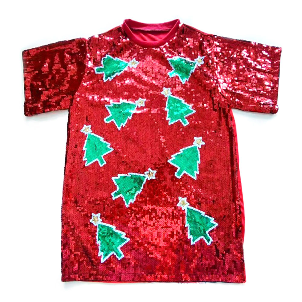 Details • Size : Plus Size • Bust Size : 48" - 50" L, Length : 31" L • Material : 100% Polyester • Sparkle with seasonal charm in this plus size sequin Christmas tree dress, featuring playful holiday motifs and a shimmering finish. Perfect for Christmas parties, family gatherings, or festive photos, this cheerful dress brings joy and holiday spirit to every celebration.