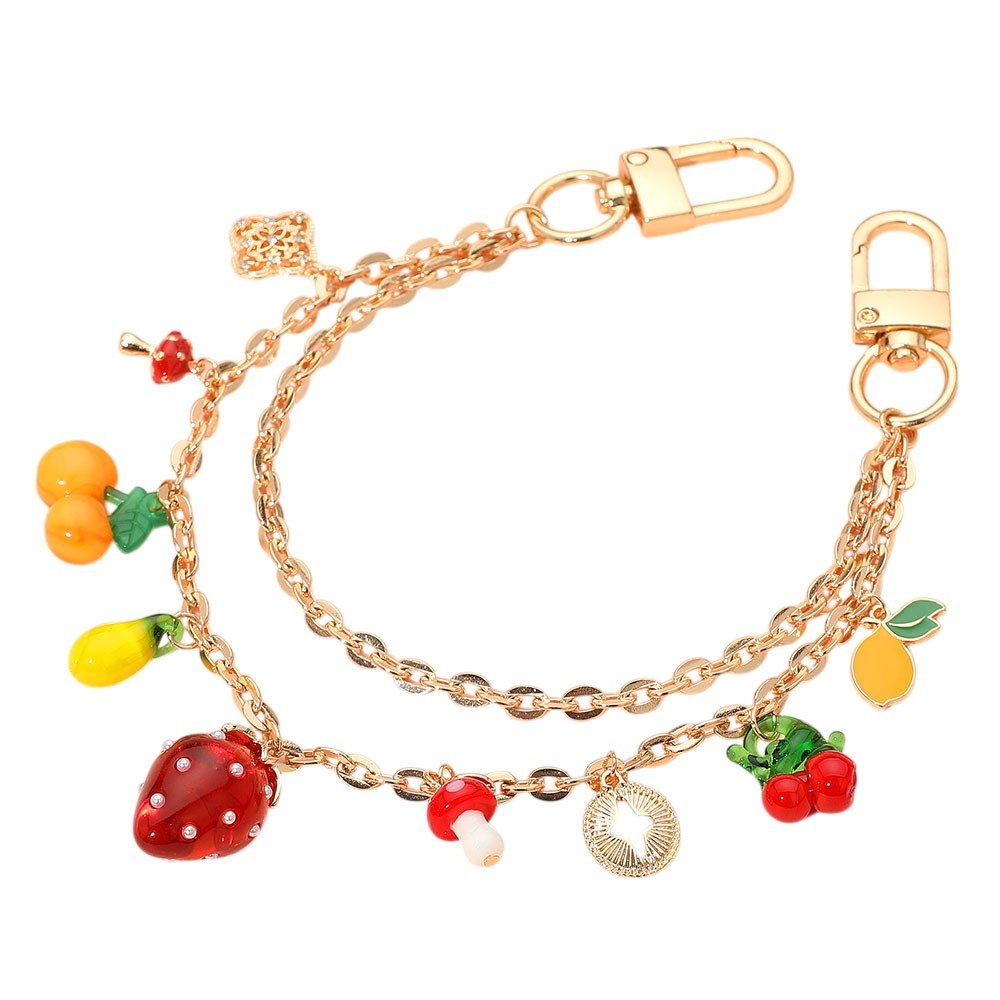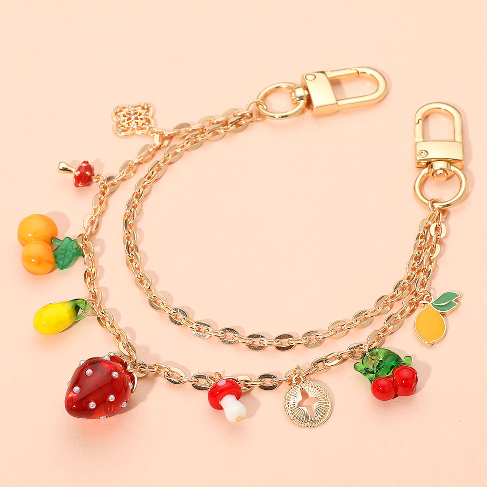 Details • Size : 11.5" L • Decor Size : 2.25" L • Add a playful touch with this gold double chain bracelet featuring vibrant fruit charms like strawberries, lemons, cherries & more. Perfect for summer styling! • Lead and Nickel Compliant
