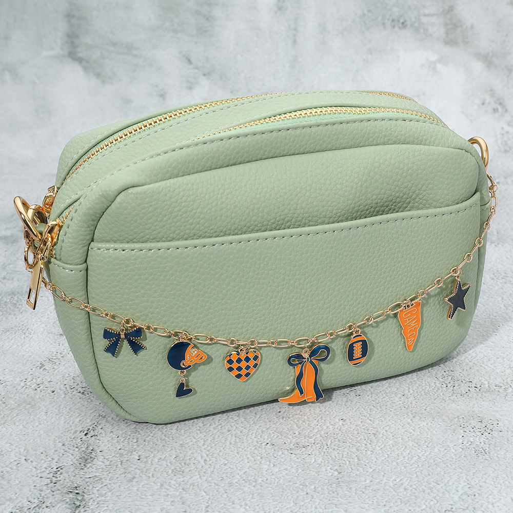 • Bag charm featuring playful gameday accents including football, helmet, boots, stars, hearts, and cheer icons. A fun accessory to show team spirit, personalize bags, and add a sporty touch to gameday outfits.