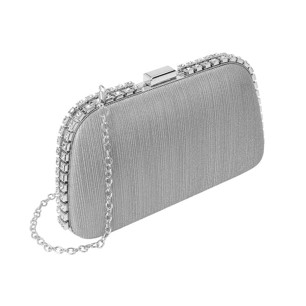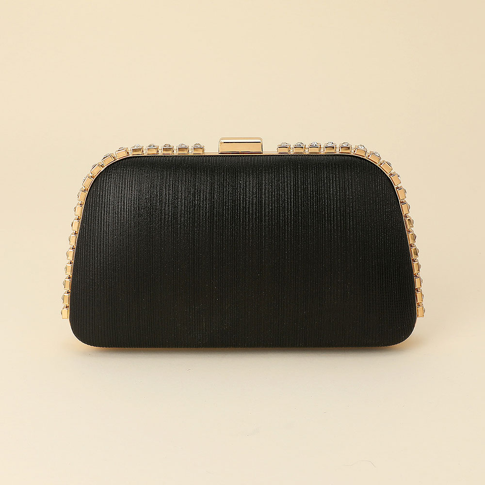 Details • Size : 8" X 4.25" X 1.5" • Strap Size : 46" L / Detachable • Clasp Closure • Chic evening clutch featuring a textured finish, shimmering rhinestone trim, and a detachable chain strap. Designed with a sleek clasp closure and gold-tone accents, this sophisticated handbag is perfect for weddings, parties, and formal events, adding timeless glamour to any outfit.