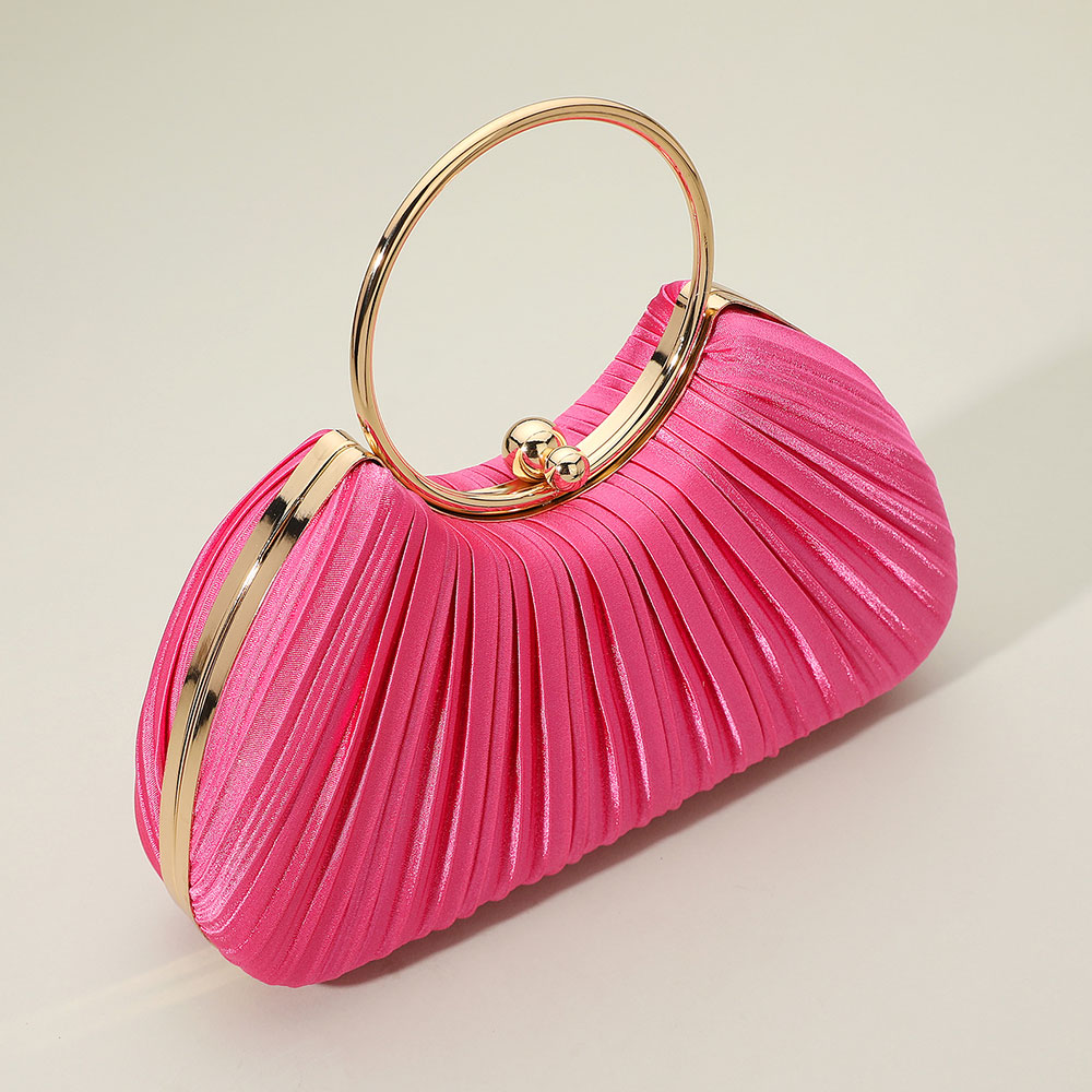 Details • Size : 9" X 5" X 2.5" • Top Handle Size : 3.75" L • Strap Size : 47" L / Detachable • Elegant pleated evening clutch designed with a round ring handle and detachable chain strap. Perfect for weddings, parties, or formal events, this chic accessory adds refined style and sophistication to any outfit.