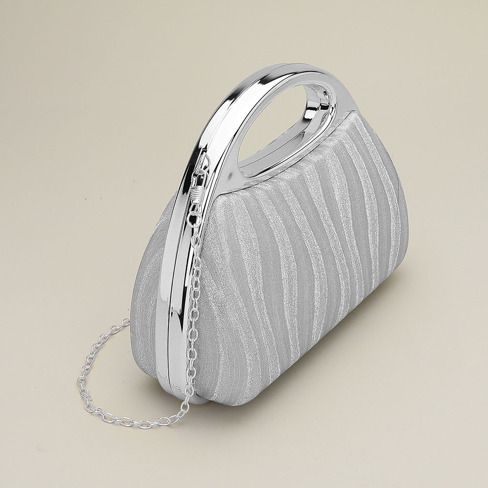 • A refined evening handbag featuring a sculpted silhouette, metallic handle, and shimmering textured body. Designed for formal events, it offers a polished finish and a detachable chain for versatile styling, keeping essentials organized while enhancing any sophisticated look.