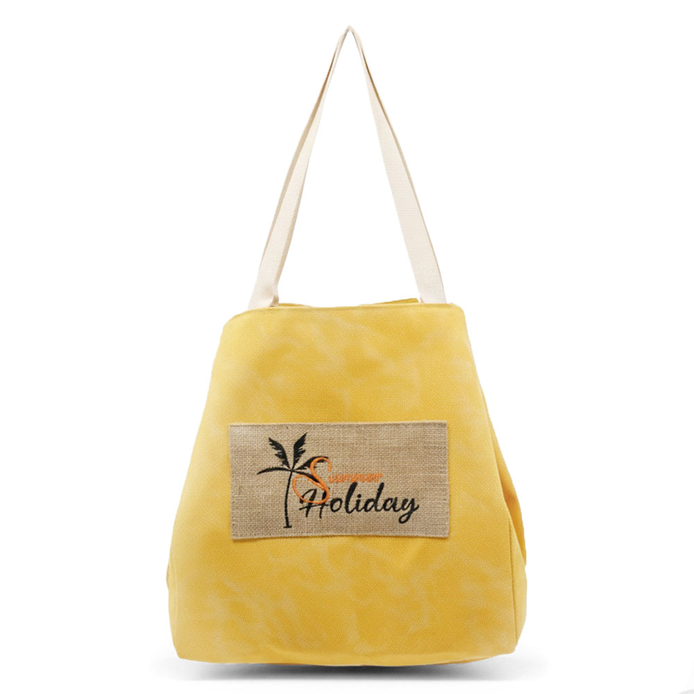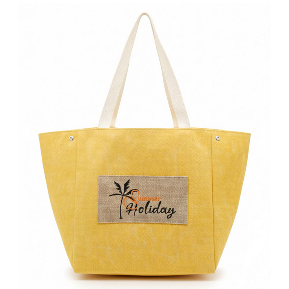 Details • Size : 22" X 13" X 9.5" • Inner Pocket • Magnetic Snap Closure • Material : 90% Polyester, 10% Burlap • Spacious everyday tote bag designed with a message patch for casual outings, travel, beach trips, and seasonal retail displays. Features a roomy interior and comfortable shoulder straps, making it ideal for carrying daily essentials, vacation must-haves, and warm-weather lifestyle accessories.