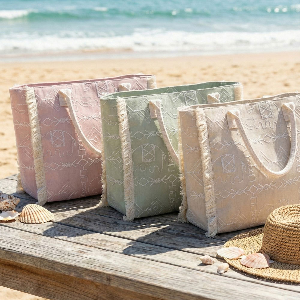 Details • Size : 21" X 14.25" X 5" • Inner Pocket • Zipper Closure • Material : 100% Polyester • Stylish everyday tote featuring a spacious interior, sturdy shoulder straps, and decorative fringe trim with an allover elephant patterned design. Ideal for shopping, travel, beach days, or casual outings, offering versatile storage and easy carry appeal for boutique and lifestyle customers.