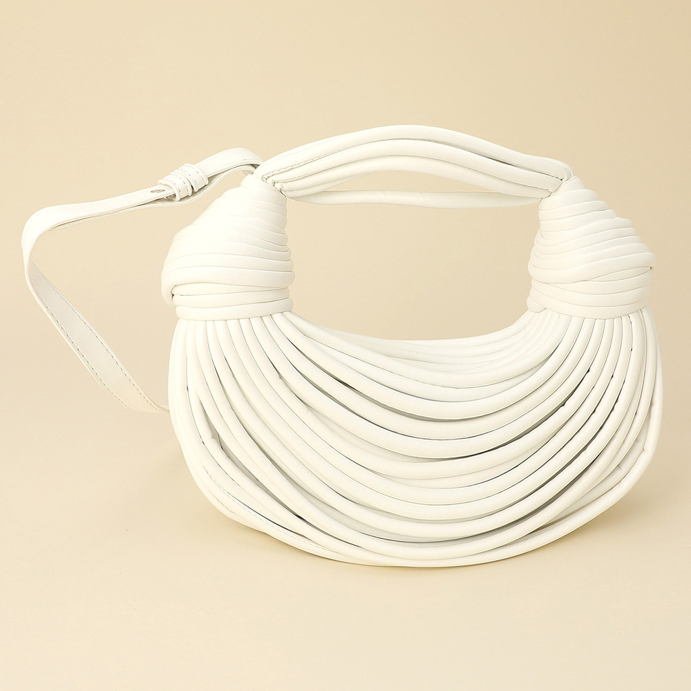 Details • Size : 11" X 4" X 3" • Top Handle Size : 5" L • Strap Size : 40" L / Adjustable, Detachable • Zipper Closure • Stand out with this textured statement shoulder bag featuring a sculpted design and intricate wrapped detailing. Its modern silhouette and artistic structure make it a versatile piece that adds a touch of high-fashion sophistication to any day or evening ensemble.
