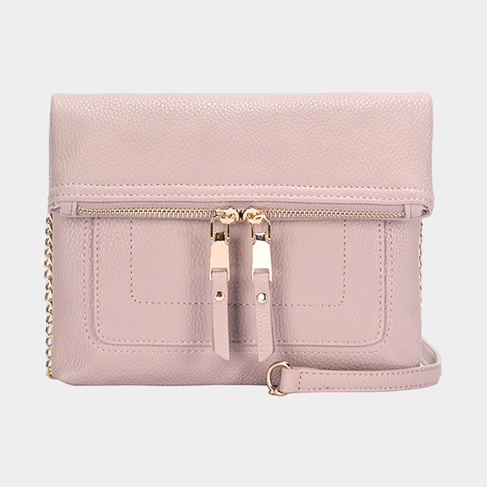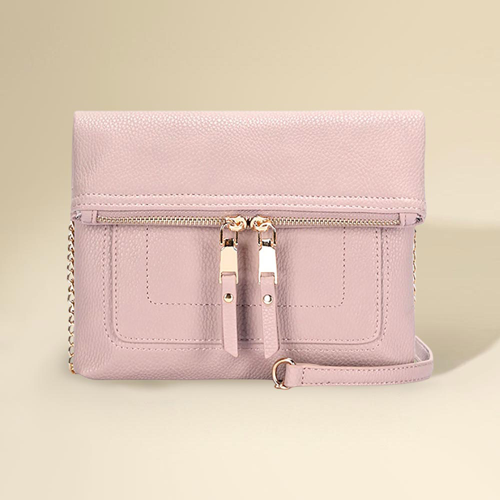• Elevate your look with this crossbody clutch featuring a sleek fold-over flap and dual zipper accents. Designed with a slim chain strap, this compact handbag offers the perfect mix of elegance and practicality for day-to-night wear.