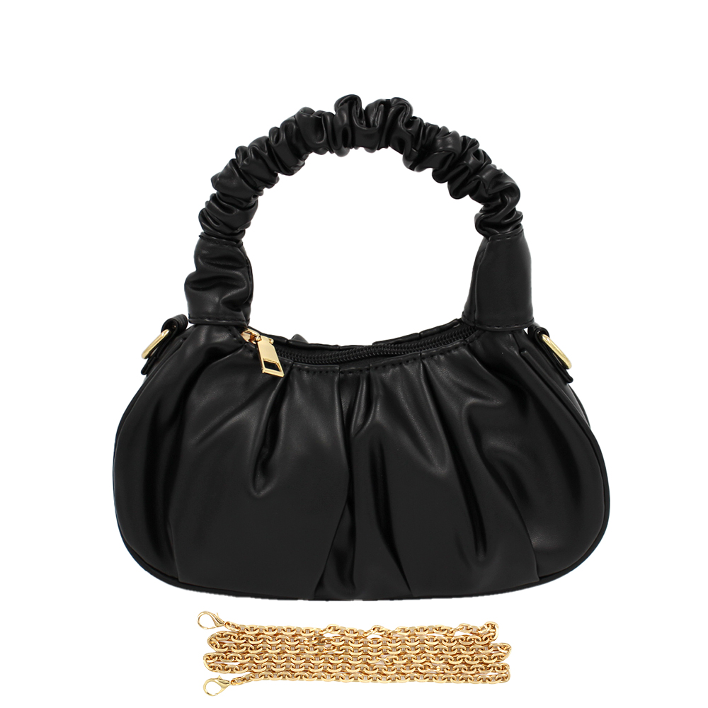 Details • Size : 8.25" X 4.75" X 2.75" • Top Handle Size : 3.25" L • Strap Size : 50" L / Detachable • Zipper Closure • Elevate any outfit with this chic black ruched handbag featuring a gathered handle and gold chain detail. Its modern silhouette and versatile design make it perfect for day-to-night wear, adding effortless style and sophistication to your look.