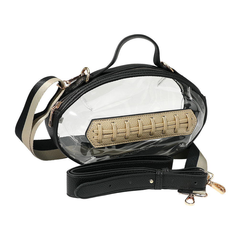 Details • Size : 10.75" X 5" X 5" X 2.6" • Top Handle Size : 2.25" L • Strap 1 Size : 36" L / Detachable, Adjustable • Strap 2 Size : 49" L / Detachable, Adjustable • Oval clear crossbody bag with wide adjustable strap, zip closure, and bold front accent detail. Lightweight and stadium-approved, this stylish accessory blends fashion and function for everyday or event use.