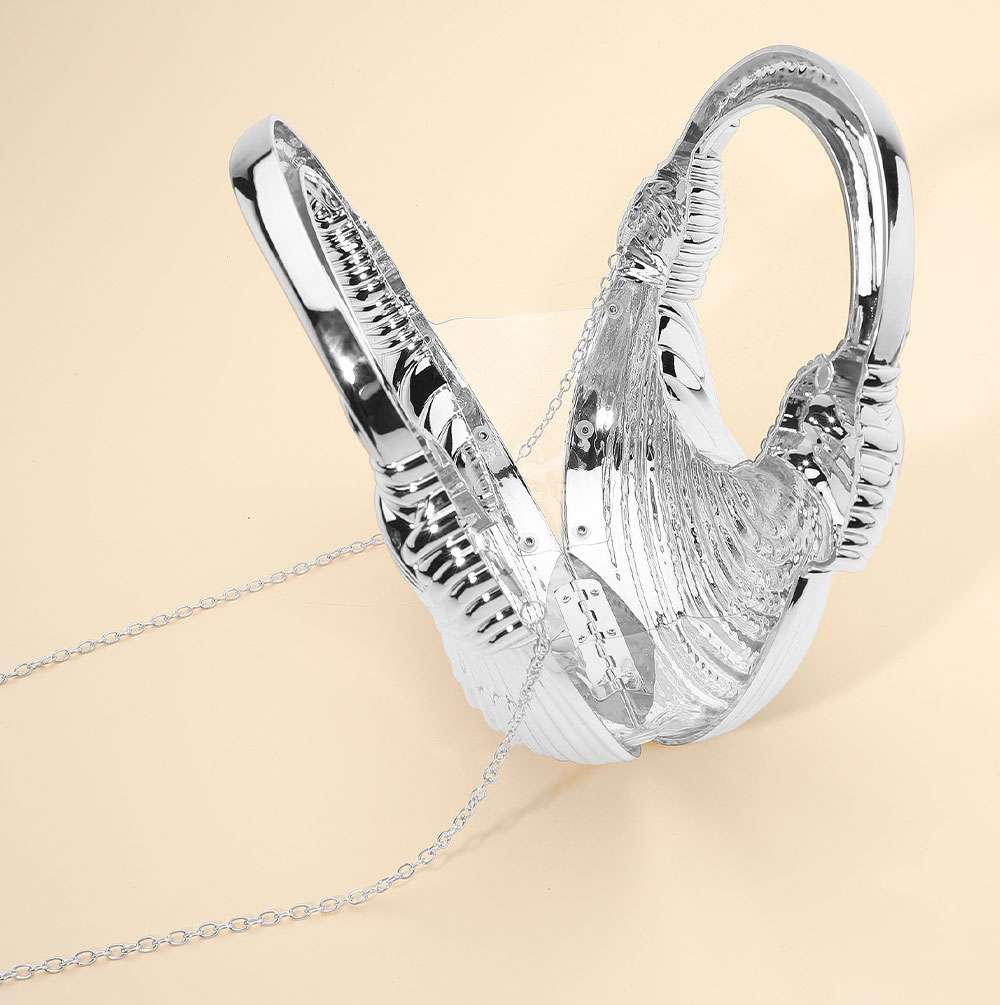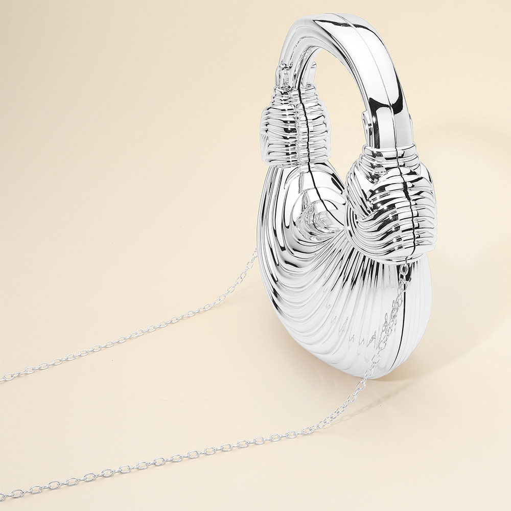 Details • Size : 10" X 10" X 3.25" • Top Handle Size : 5" L • Strap Size : 46" L / Detachable • Magnetic Closure • This sculpted fashion bag features a distinctive loop-handle silhouette with layered, curved ridges that create a bold, fluid shape. A sleek chained detail adds versatility, making it an expressive accessory that elevates evening outfits and modern, statement-driven looks.