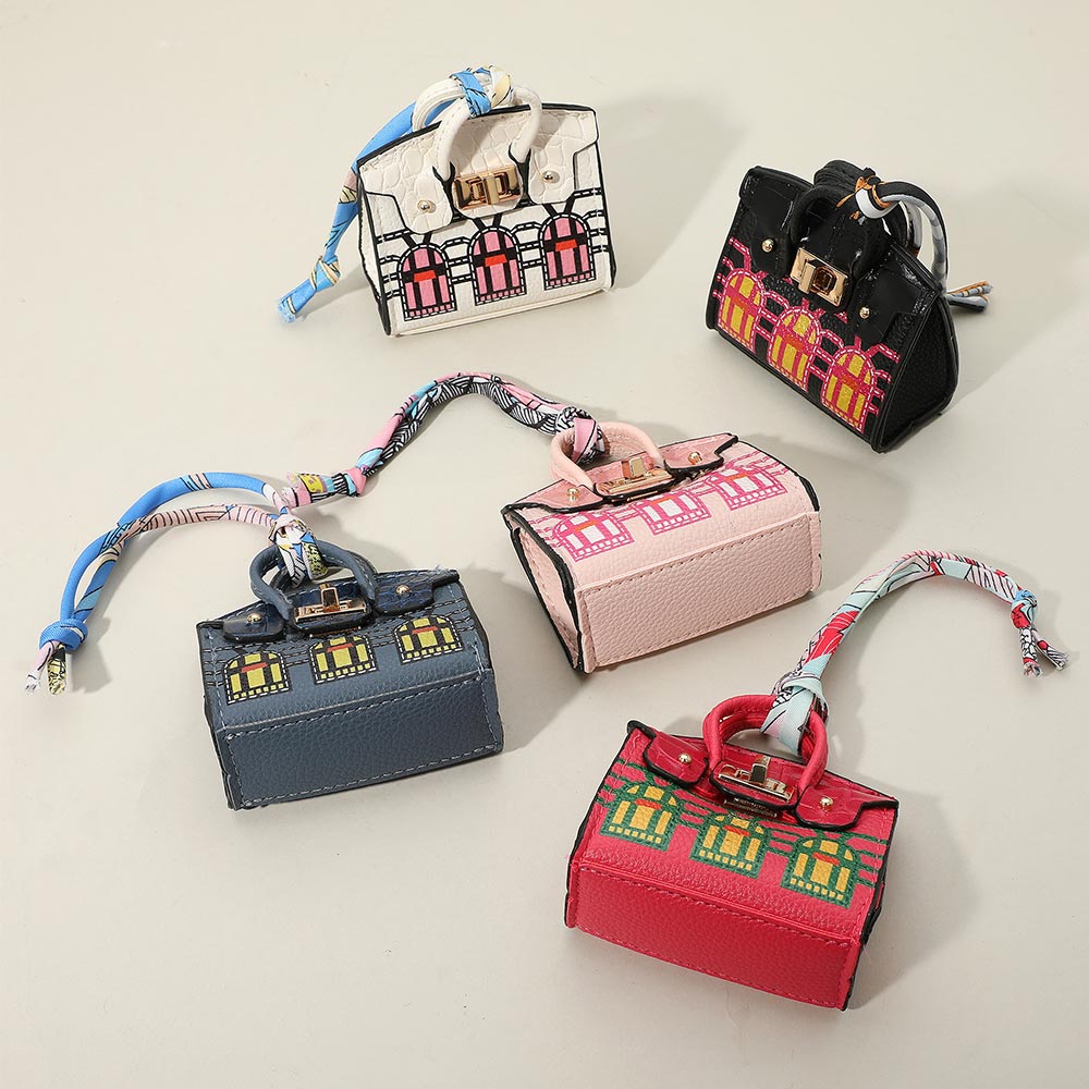 Details • Size : 3" X 2.75" X 1.5", 1" L • Strap Size : 7" L / Detachable • Miniature handbag-style lock closure • Decorative metal rivets and clasp hardware detail • fits Earphone, Earbuds, Small Accessory • Can be used as a keychain, bag charm, or collectible accessory • Add a fun touch to your look with this mini printed handbag keychain. Featuring a detailed window pattern and scarf accent, it's a stylish charm for bags or keys with a playful twist and functional clasp.