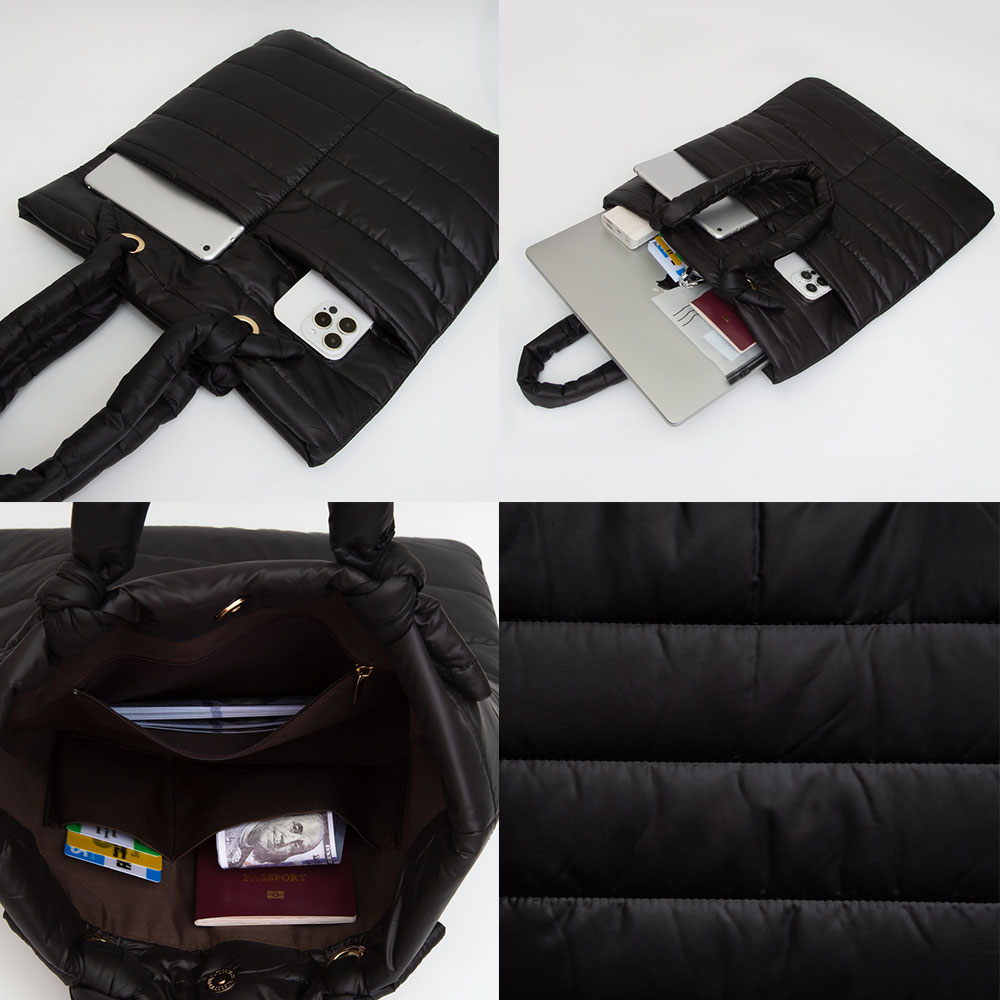 • A lightweight quilted tote bag featuring a sleek padded finish, roomy interior, and comfortable handles for effortless everyday carry. Its clean, modern silhouette makes it ideal for work, errands, or travel while adding a refined, cozy touch to any outfit.