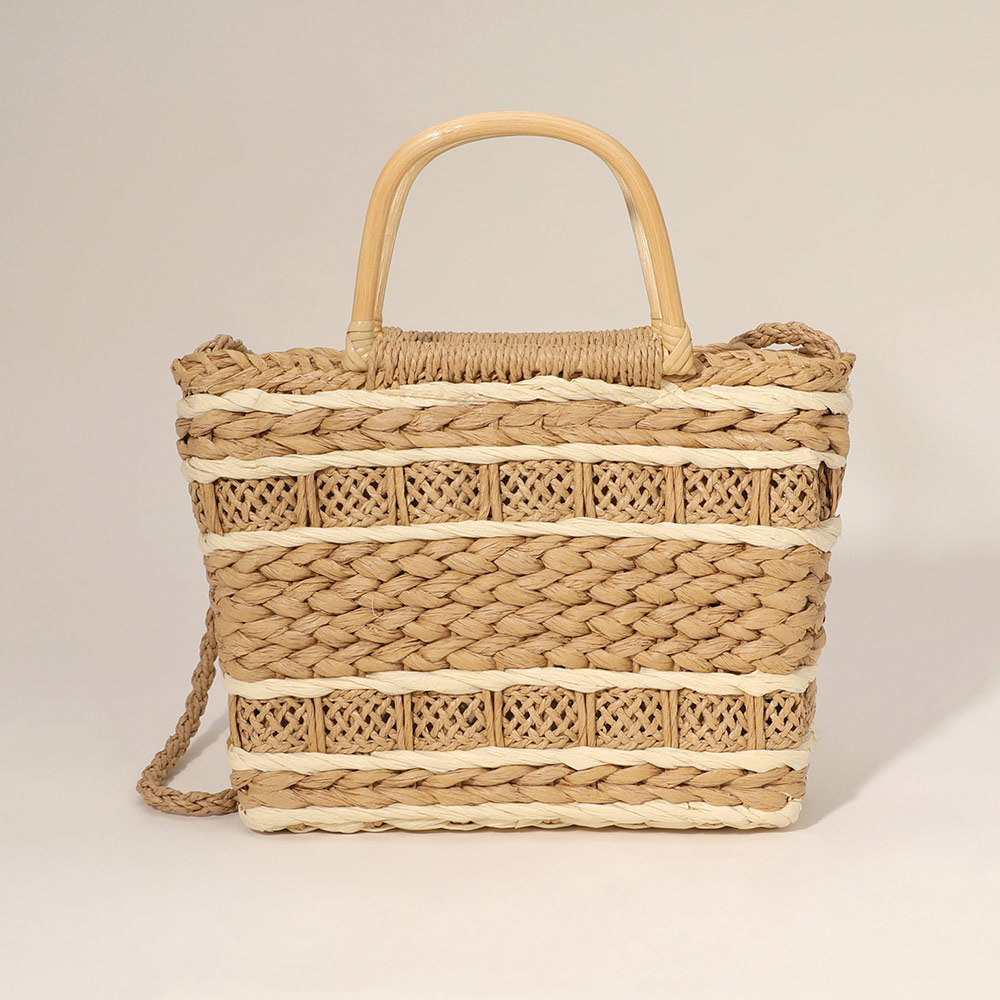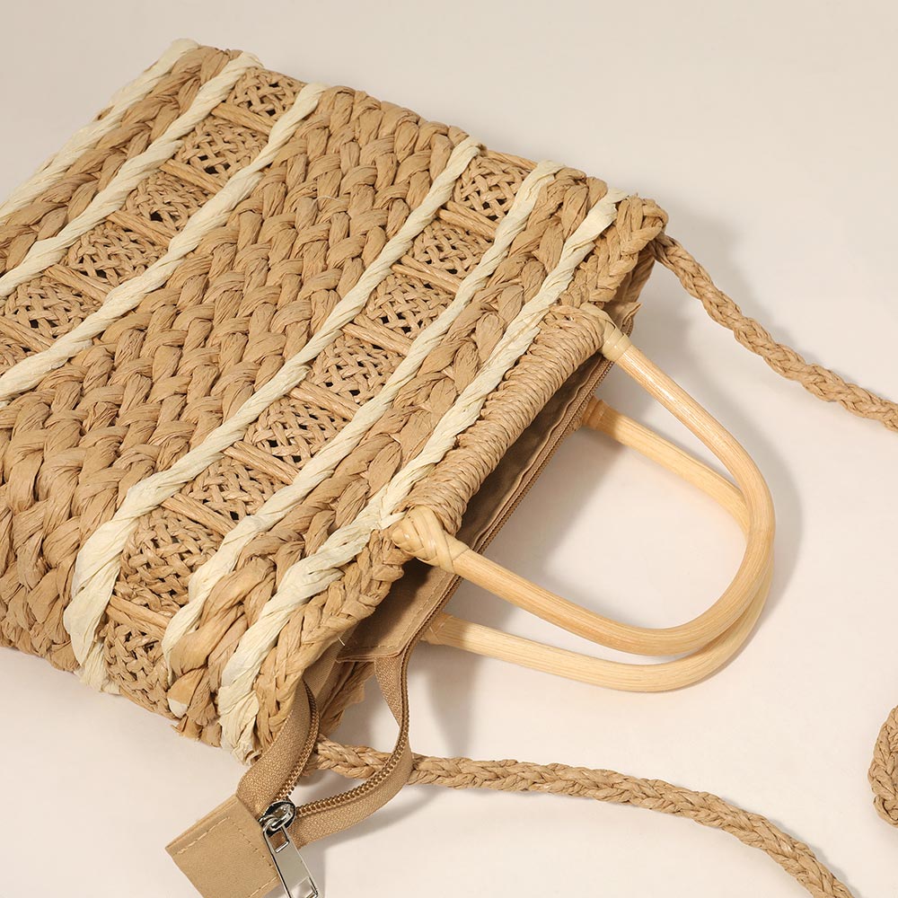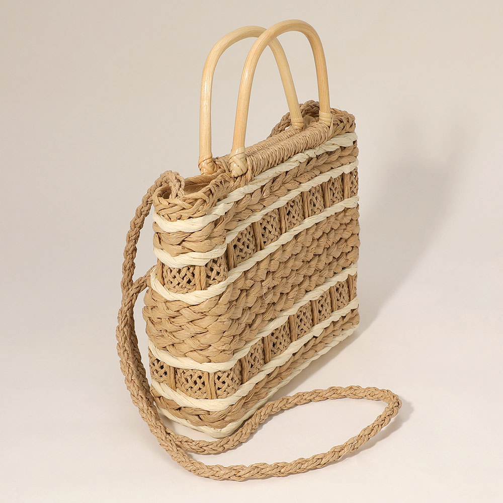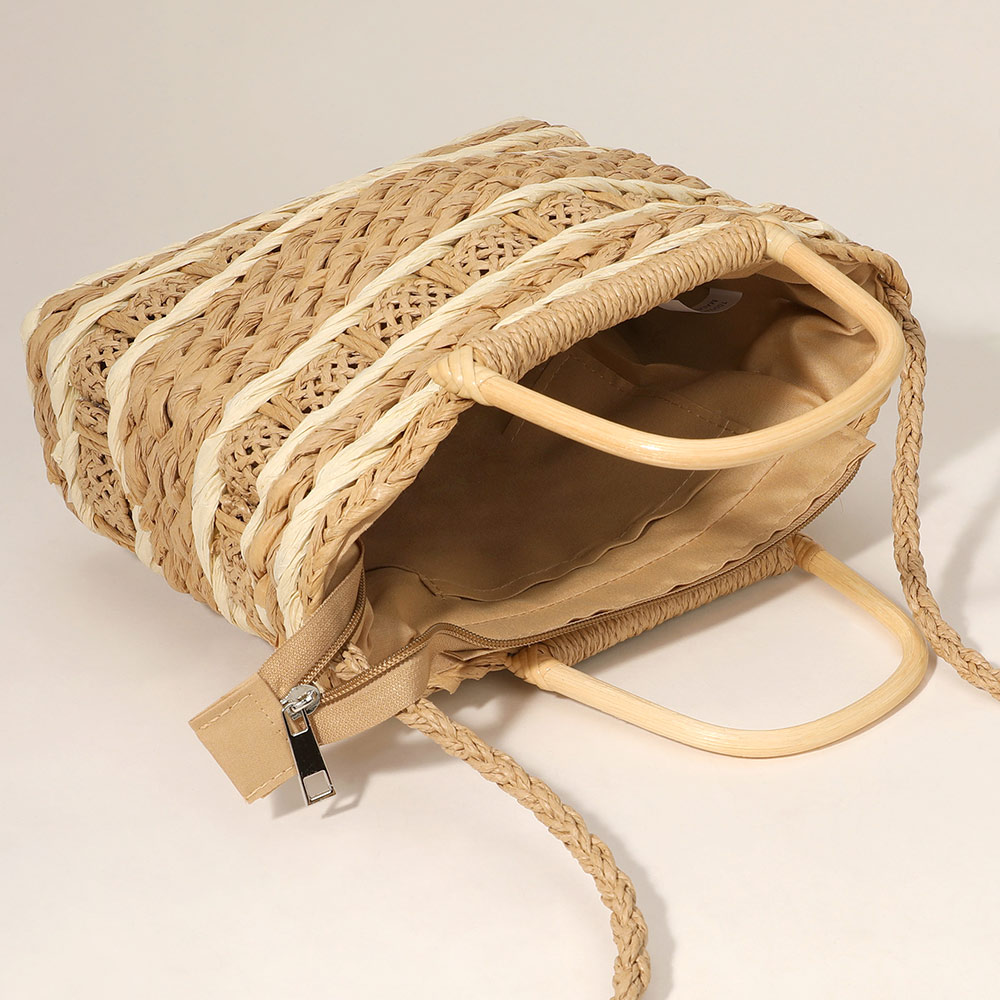 Wooden Top Handle Weave Straw Tote Bag / Crossbody Bag