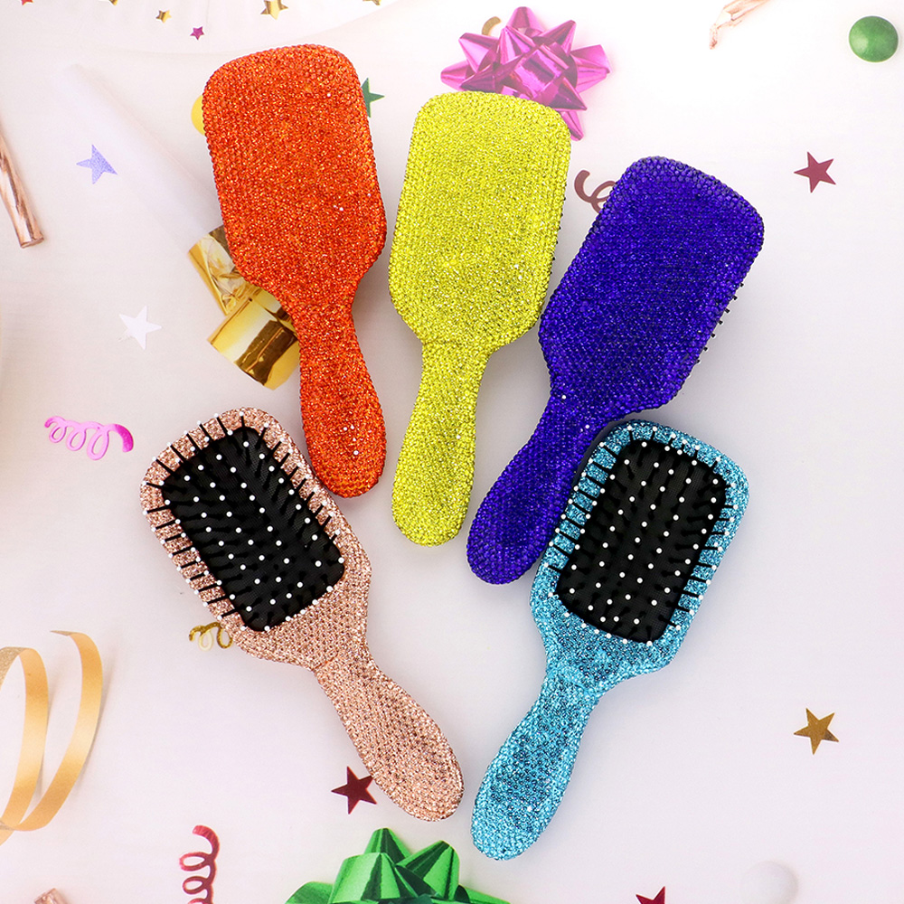 • Elegant paddle hair brush adorned with rhinestones for a stylish touch. Ideal for detangling and smoothing hair with ease, featuring ball-tip bristles for gentle grooming.