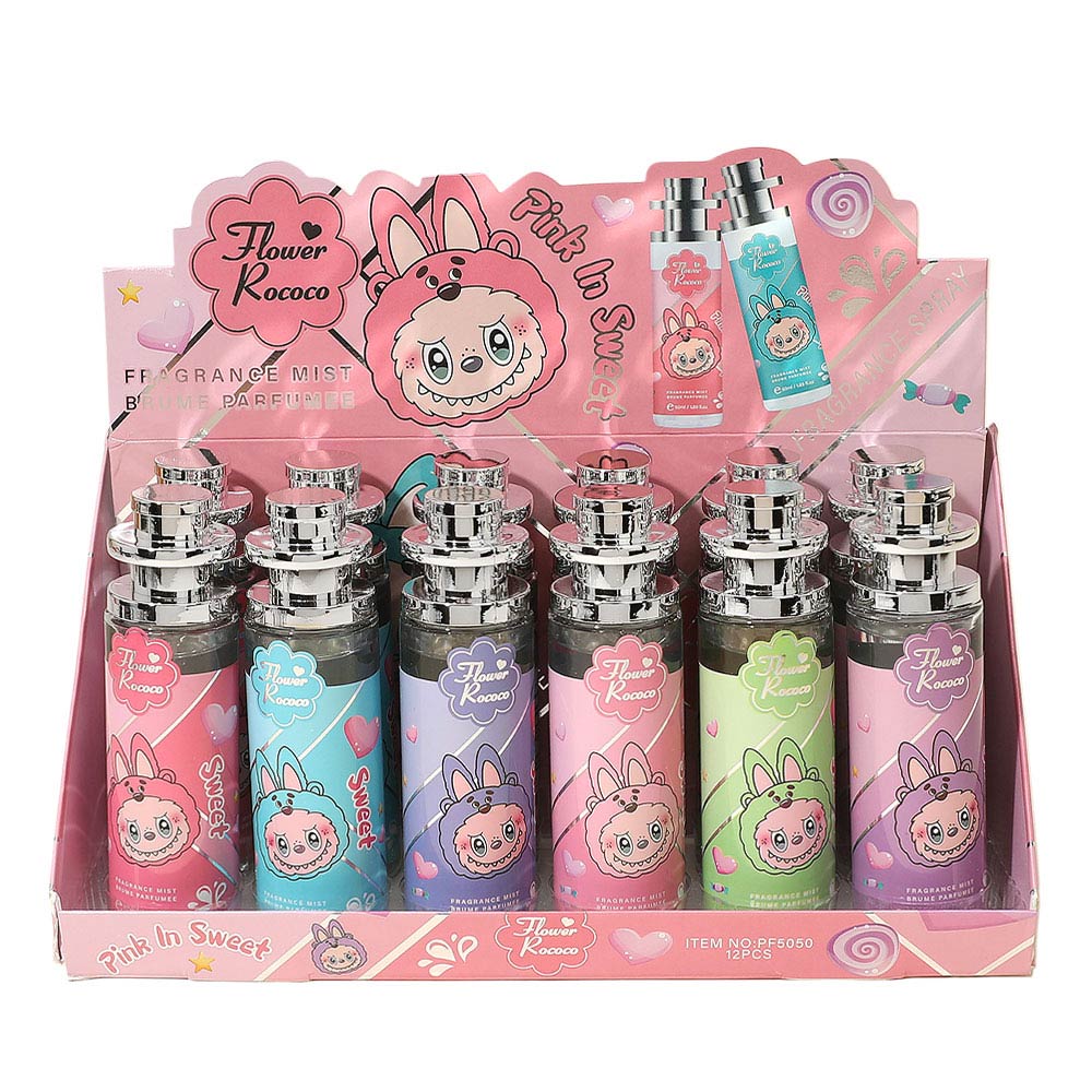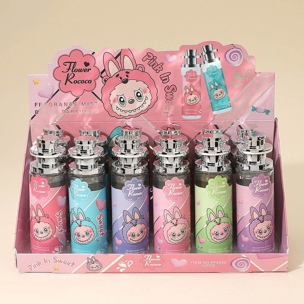 Details • Size : 1.4" X 4" • This adorable fragrance mist set features charming monster bunny character-themed bottles in assorted scents, perfect for gifting or daily use. The compact design makes each spray easy to carry, while the vibrant display adds playful appeal to any collection or retail space.