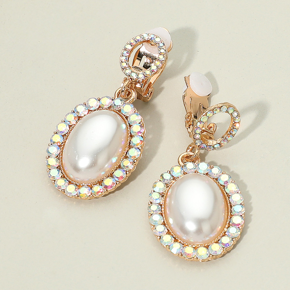 Details • Size : 0.75" X 1.75" • Clip On • Elevate your look with these oval pearl drop clip-on earrings, framed by a sparkling rhinestone halo. Designed for non-pierced ears, these timeless earrings blend classic elegance with modern shine, making them perfect for weddings, parties, and formal occasions.