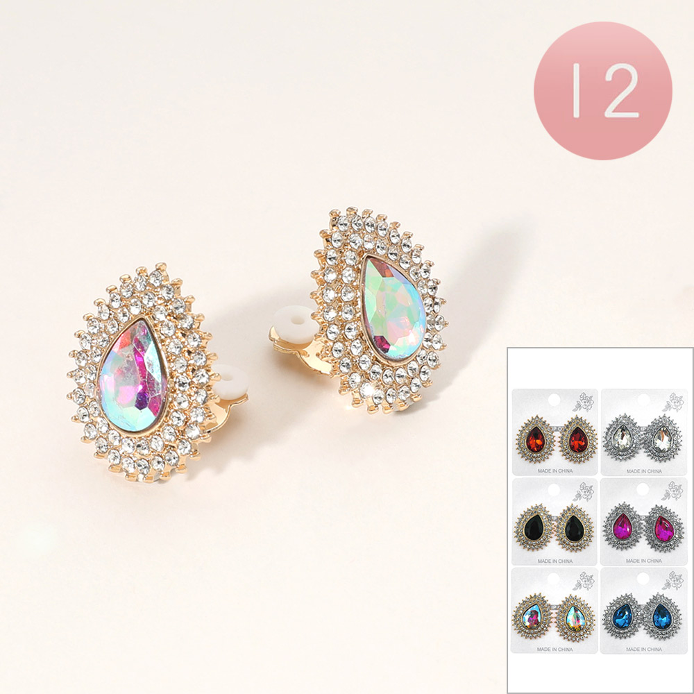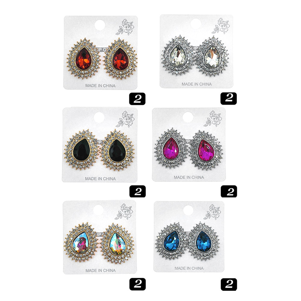 12Pairs - Teardrop Glass Stone Cluster Clip On Earrings