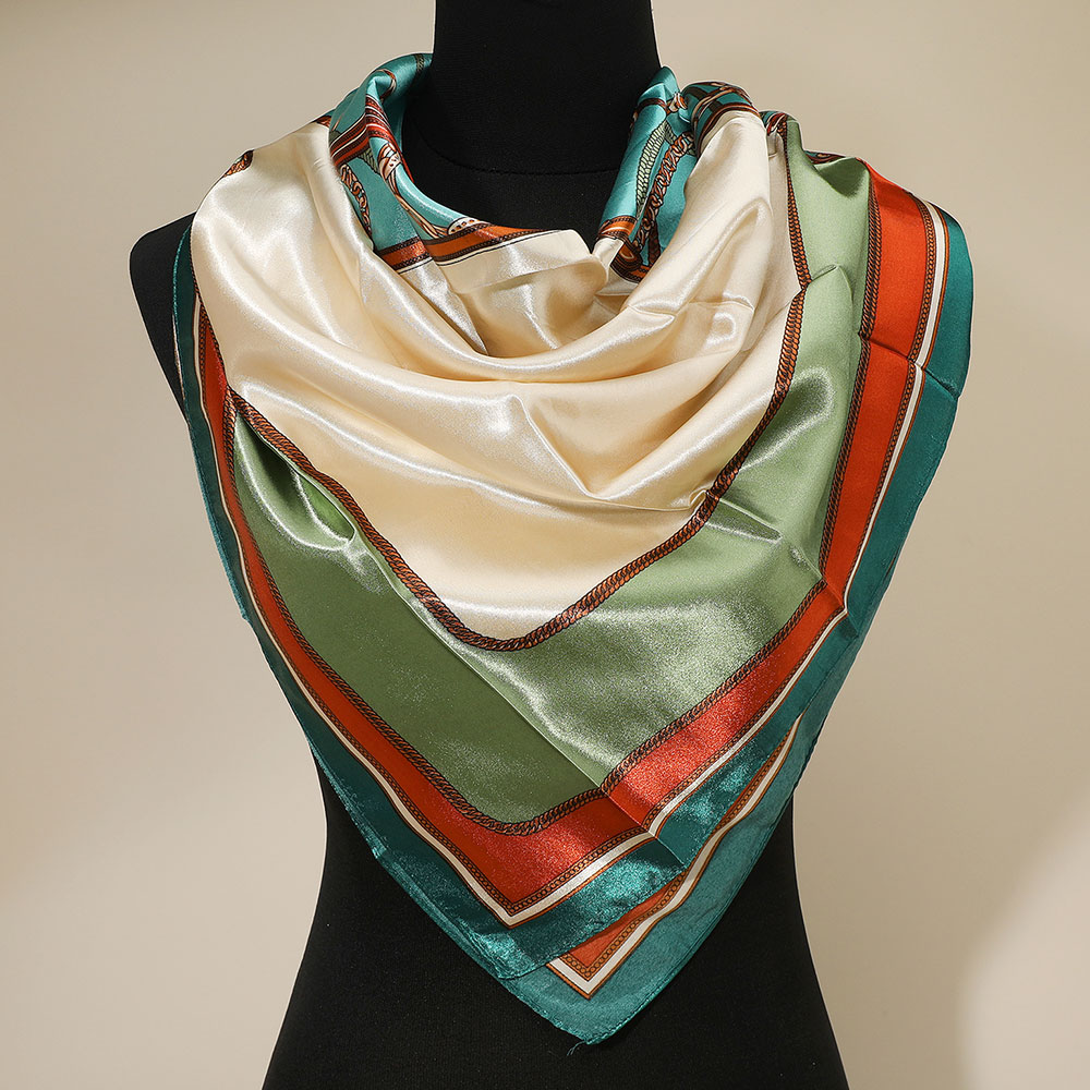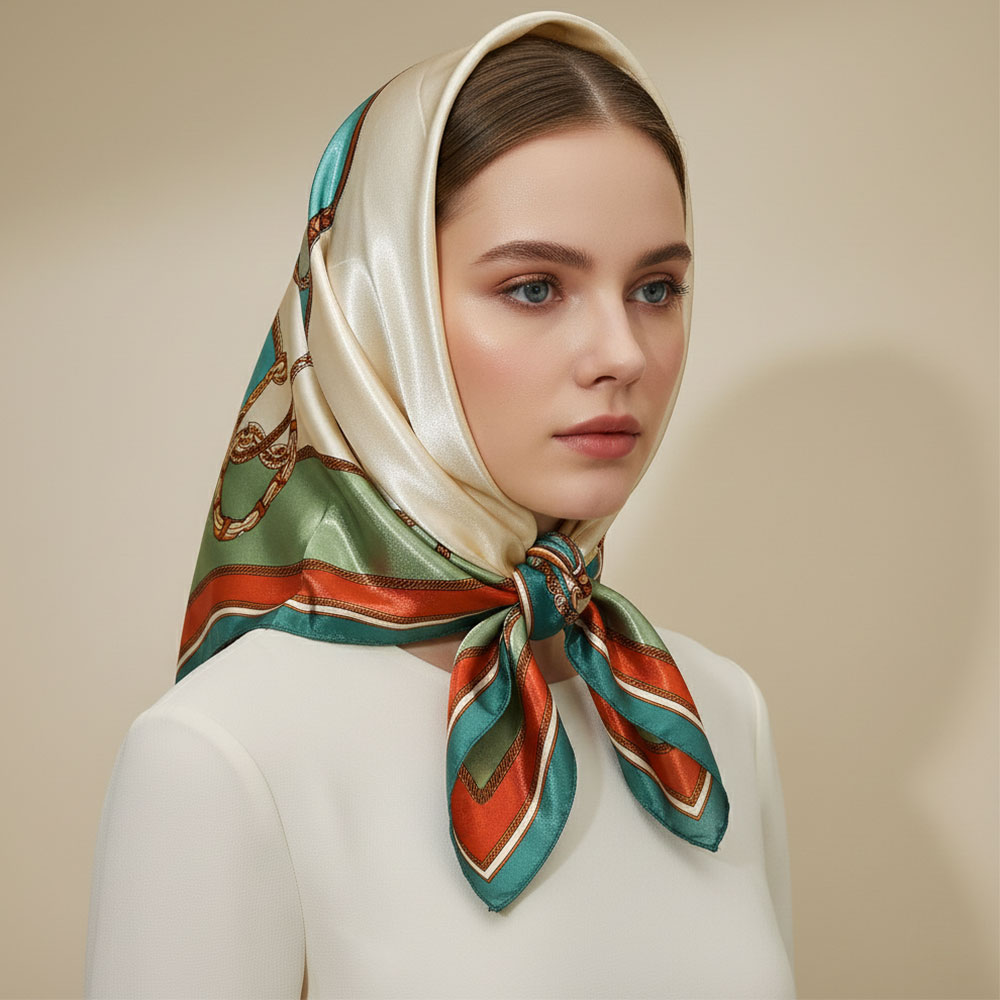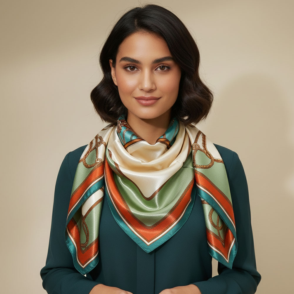 Details • Size : 36" X 36" • Material : 100% Polyester • A chic square scarf showcasing elegant motifs that add instant polish to any look. Ideal for neck styling, bag accents, or hair ties, it offers versatile wear and effortless sophistication for daily outfits or special occasions.