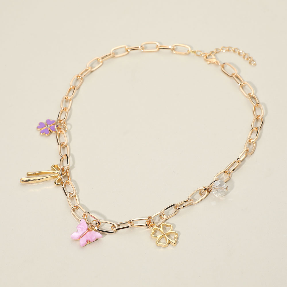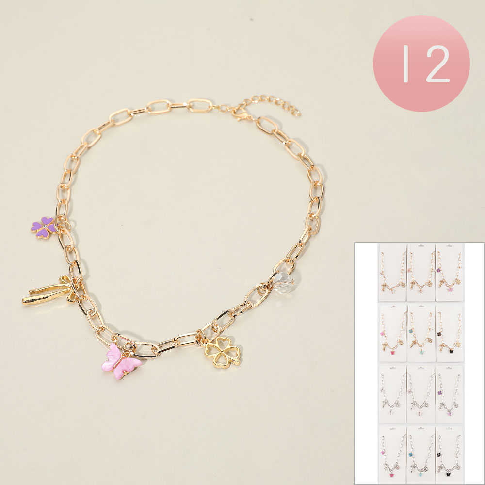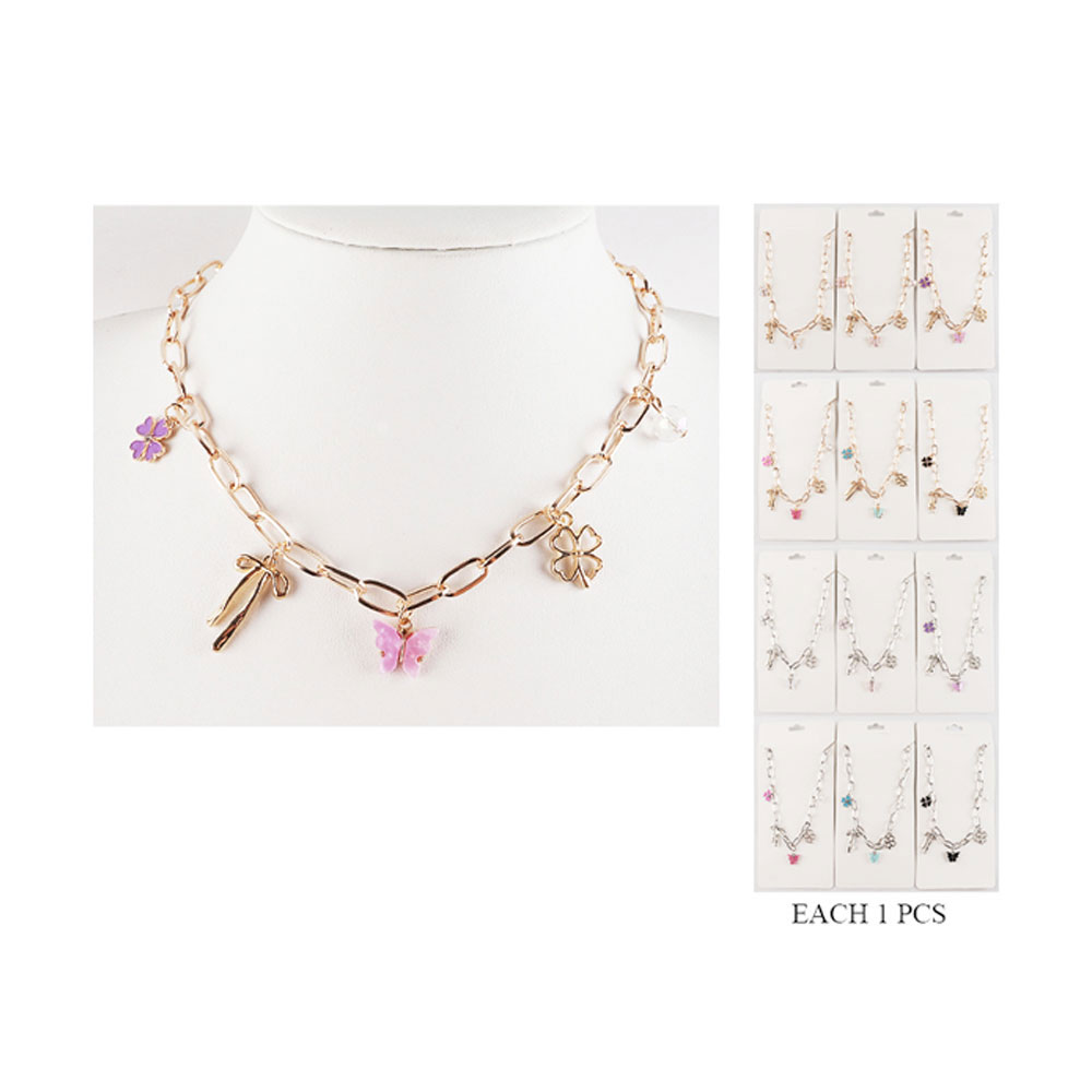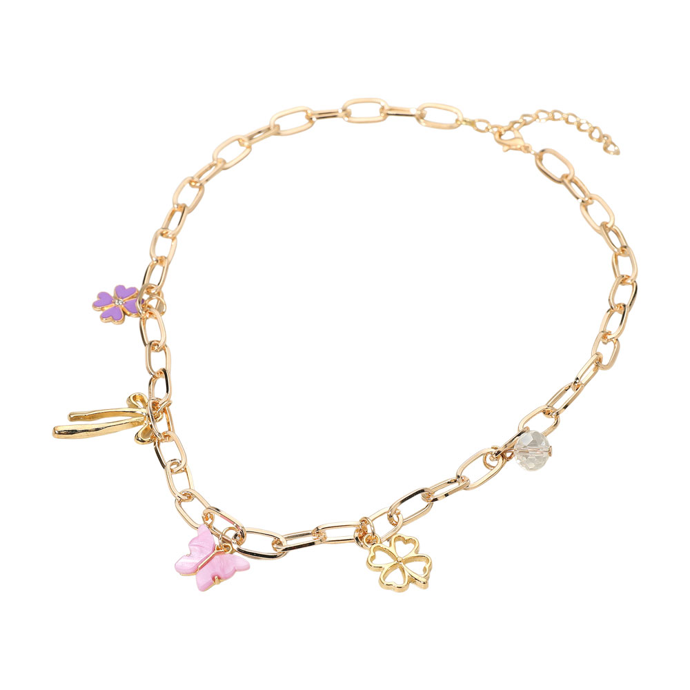 Details • Necklace Size : 16.5" + 2" L • Decor Size : 1.4" L • This charming necklace features a mix of delicate pendants including butterfly, clover, and floral motifs suspended from a fine linked chain. Adjustable for the perfect fit, it brings a playful elegance to any look and makes a delightful accent for everyday or special occasions.
