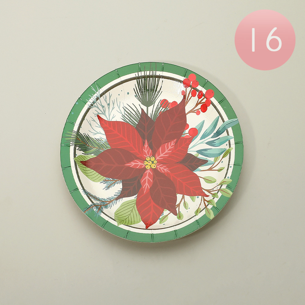 Details • Size : 7" X 7" • Serve holiday meals in festive style with these poinsettia paper plates featuring a vibrant floral design and green border. Perfect for Christmas dinners, parties, and seasonal gatherings, this 16-pack combines convenience with cheerful holiday elegance.
