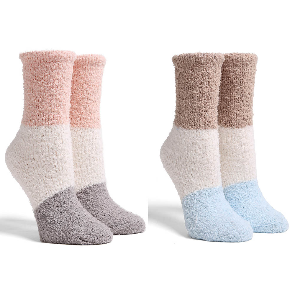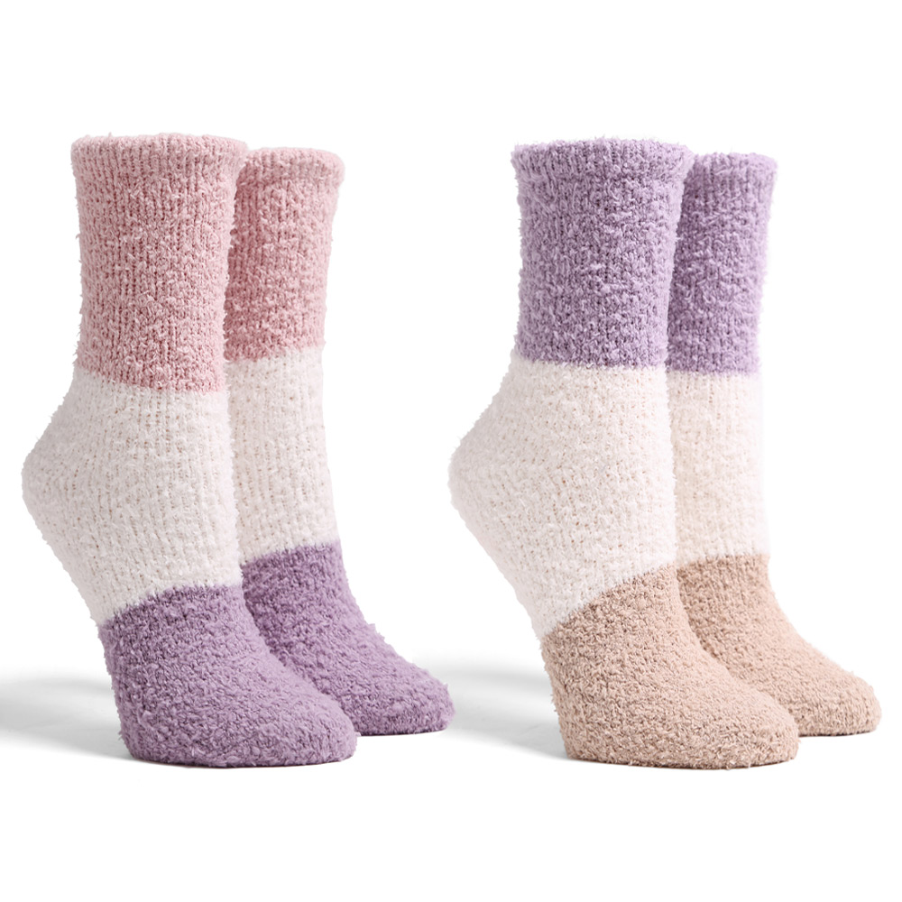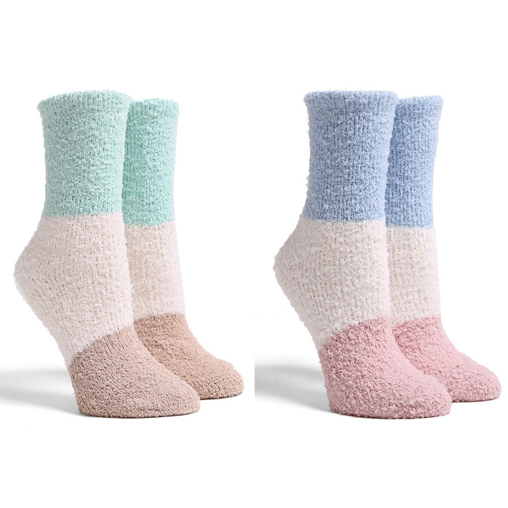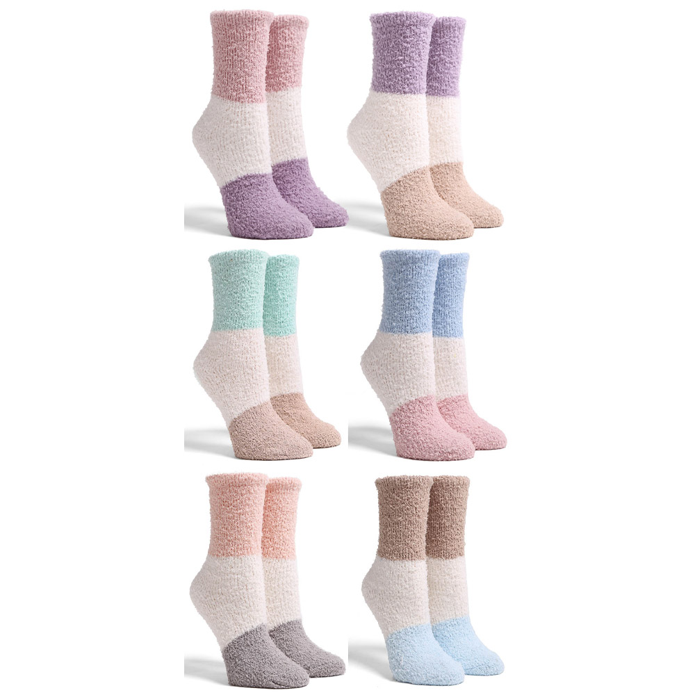 Details • Size : 9 - 11 • Material : 100% Poly. Microfiber • Plush fuzzy socks set with modern color block designs for a cozy, stylish look. Perfect for lounging, relaxing, or gifting, these soft and stretchy socks keep feet warm and comfortable all day. Ideal for daily indoor wear or relaxing moments in colder seasons.